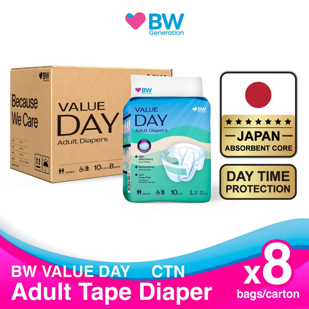 BW - Value Day Tape Adult Diapers Carton (10pcs/bag, 8 bags/Carton, Size S/M/L/XL)