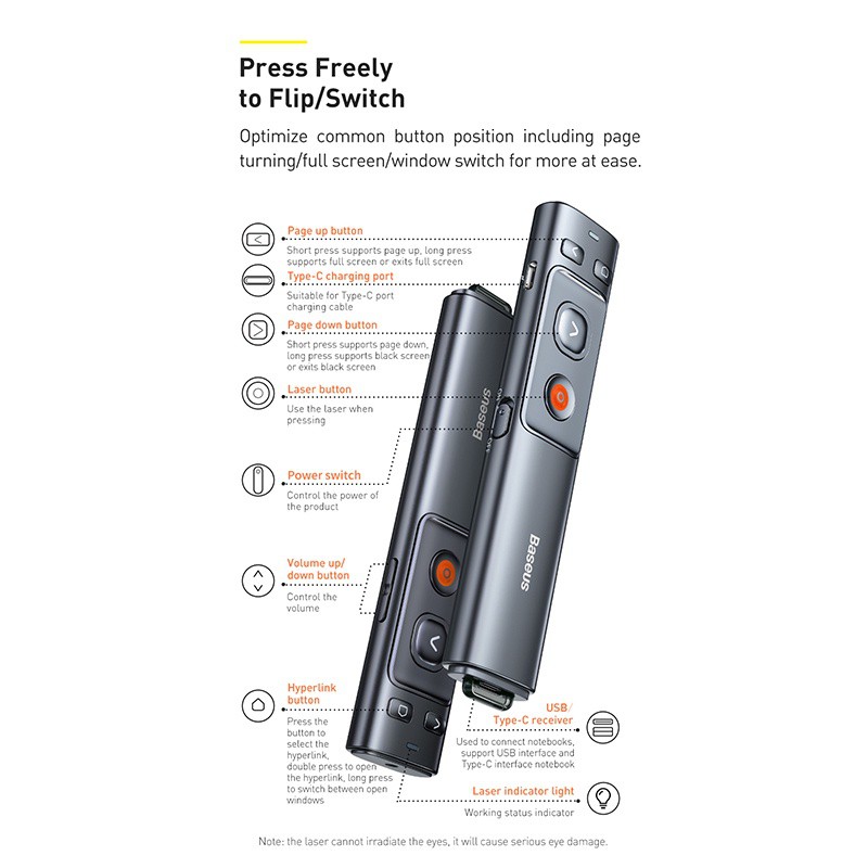 Baseus Rechargeable Wireless Presenter (Red Laser) Controller Compatible with Windows Linux Android Supports Excel PPT Word