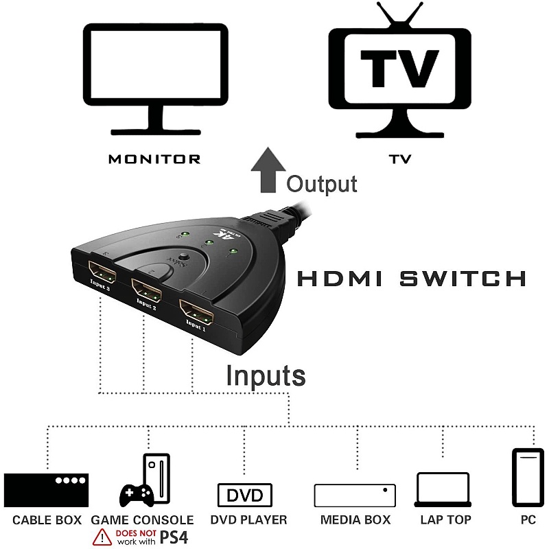 Benosem HDMI Switcher 3 in 1 out 3 Port 4K HDMI 3x1 Switch Splitter with Pigtail Cable Supports Full HD 4K1080P 3D Player Video converter