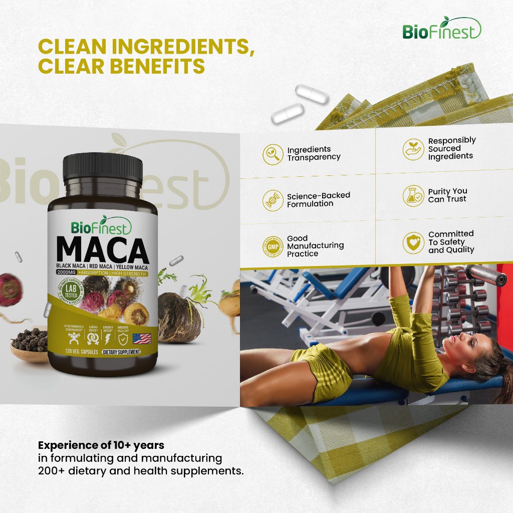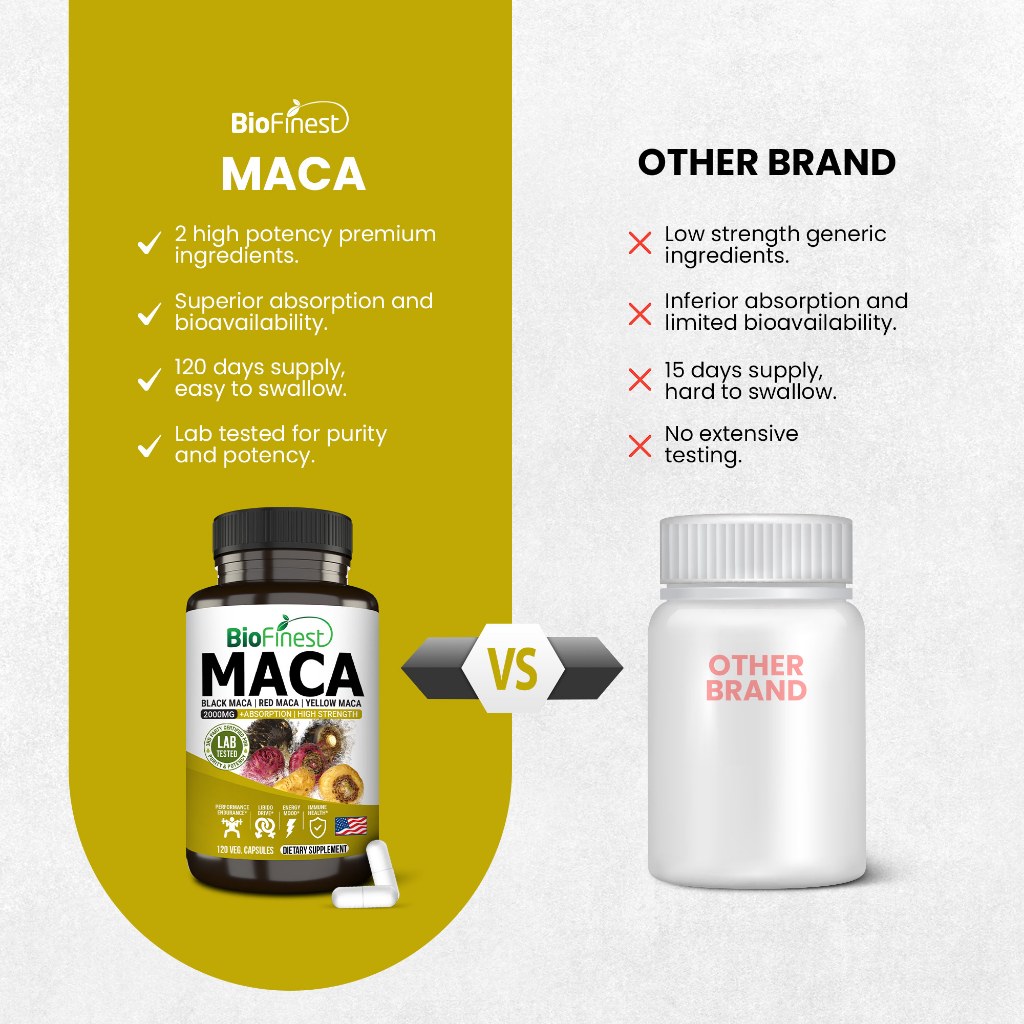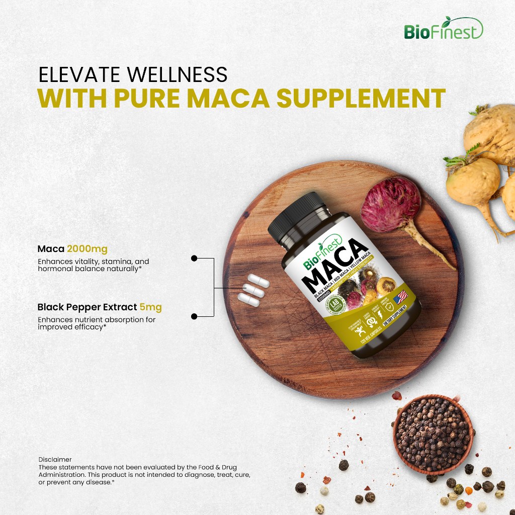 Biofinest Peruvian Maca 2000mg - 3x Black Red Yellow Maca Root Supplement - Men Women Energy Stamina Vitality (120caps)