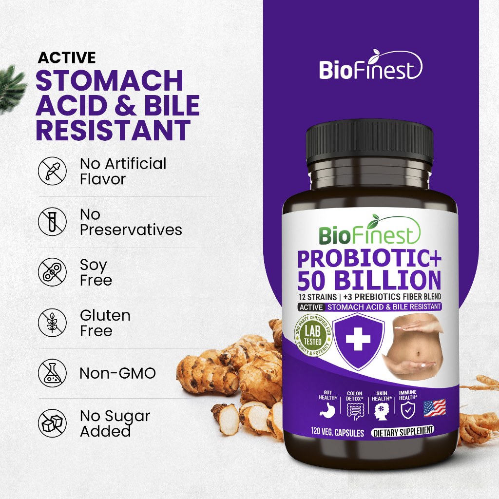 Biofinest Probiotic 50 Billion CFU Enzyme Supplement 12 + 3 Prebiotics - Diet Slimming Eczema Detox Men Women (60 caps)
