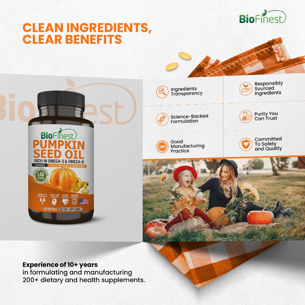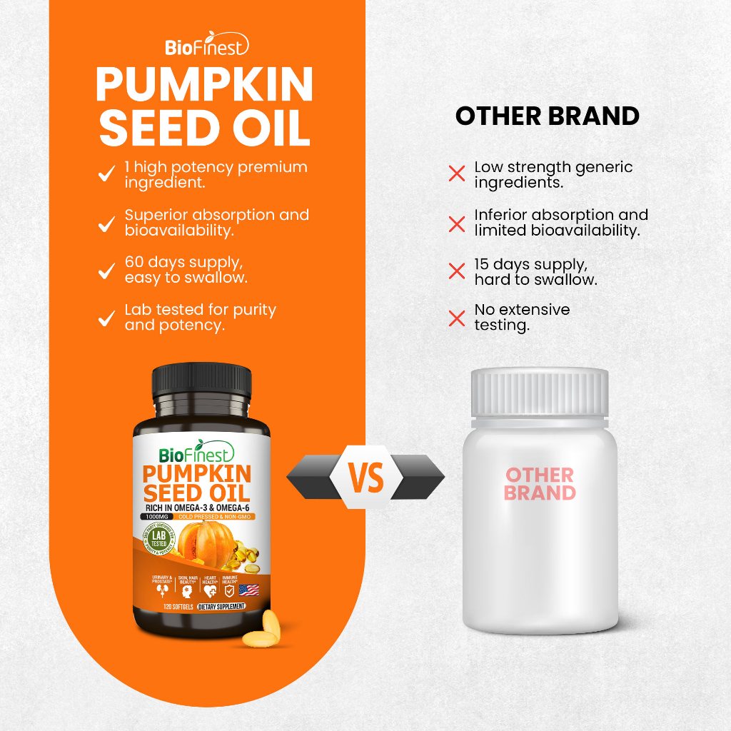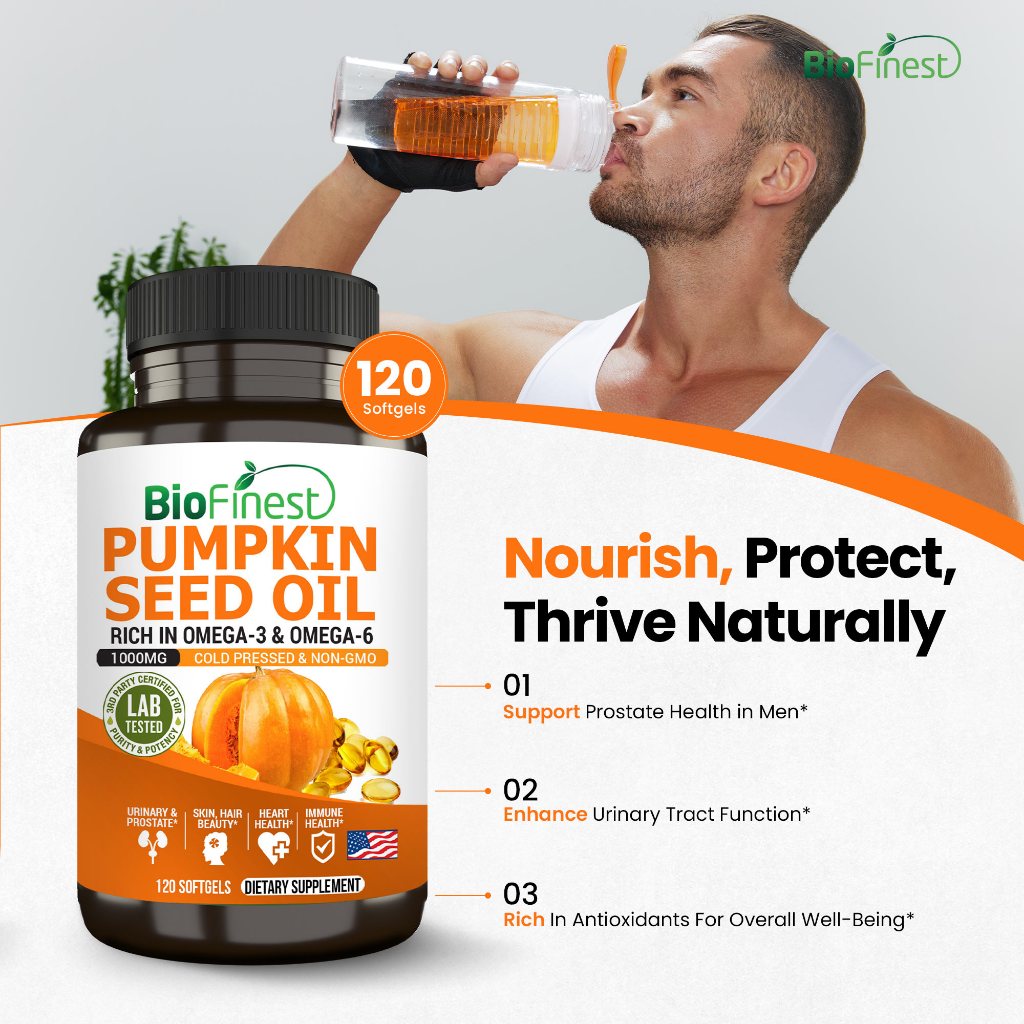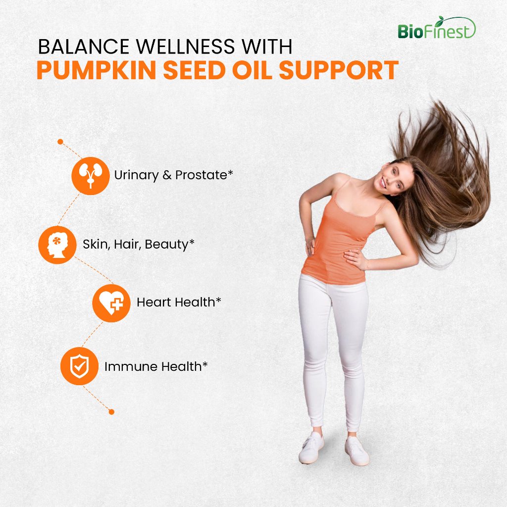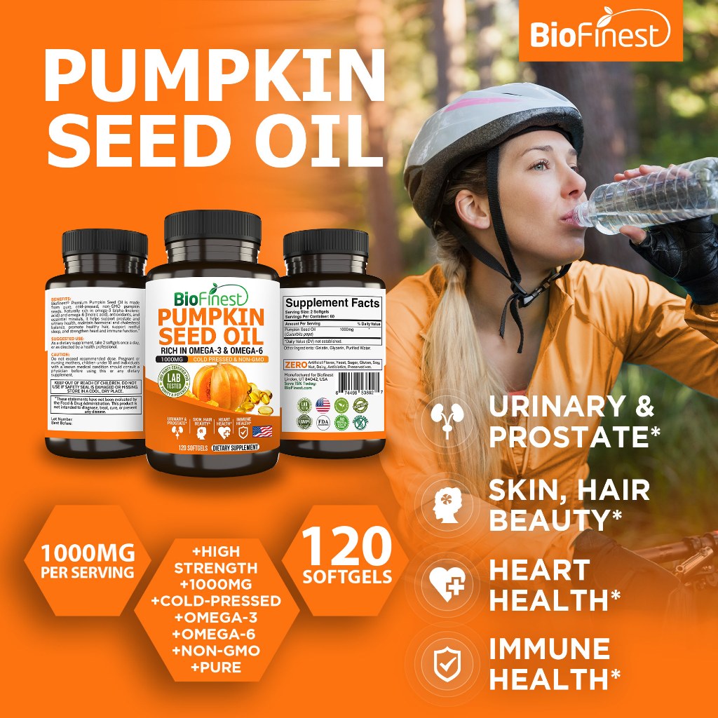 Biofinest Pumpkin Seed Oil Supplement - 1000mg Cold Pressed Omega 3 6 Cholesterol Hormone Balance Prostate Urinary