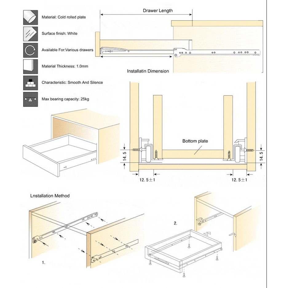 Bottom Mount White Drawer Slide Track Rail Slider for Cabinets Closet Kitchen Drawers (1 Pair - Left Right)