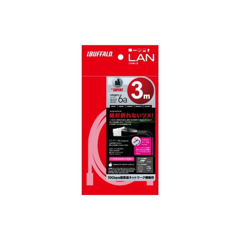 Buffalo BUFFALO, unbreakable LAN cable for modems, Category 6a, straight, flat type, black BSLS6AFU30BK.
