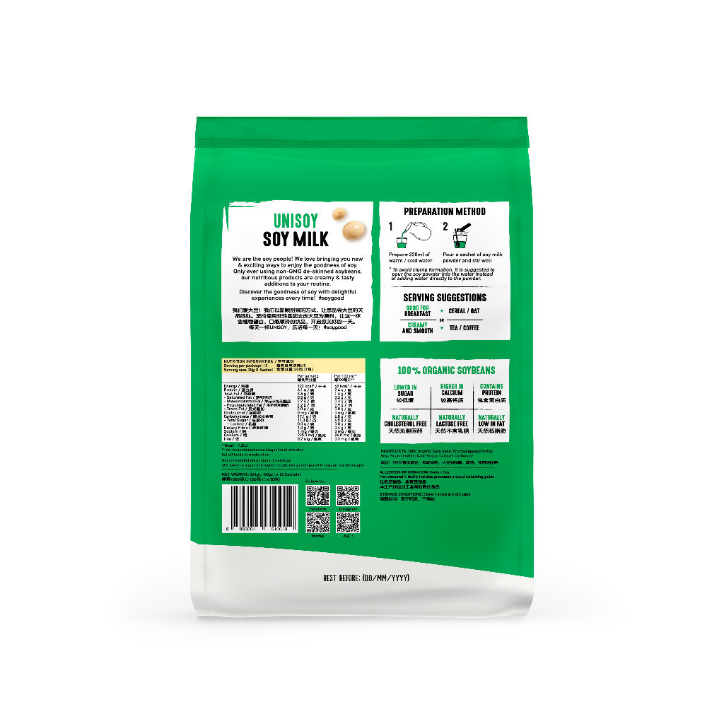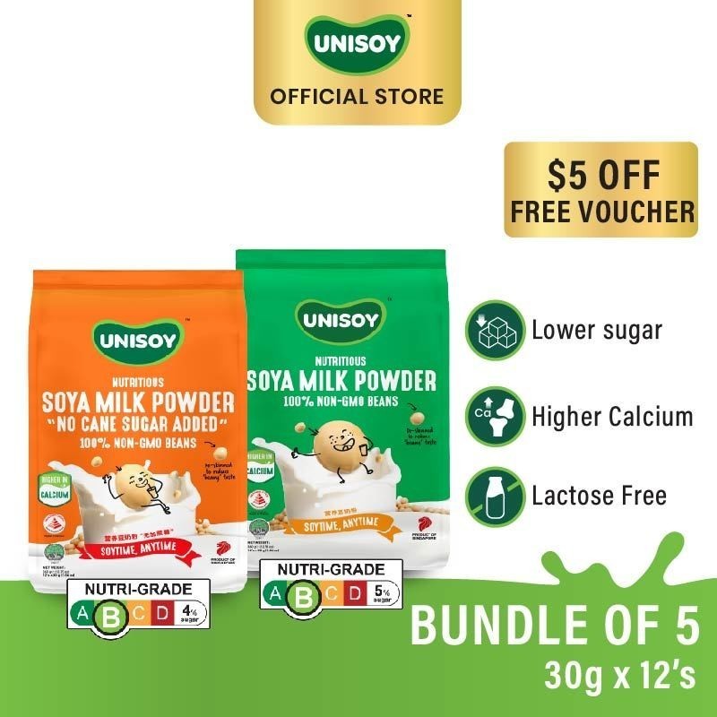Bundle 5 UNISOY Nutritious Soy Milk Powder - No Cane Sugar | Low Sugar 30g x 12 sachet