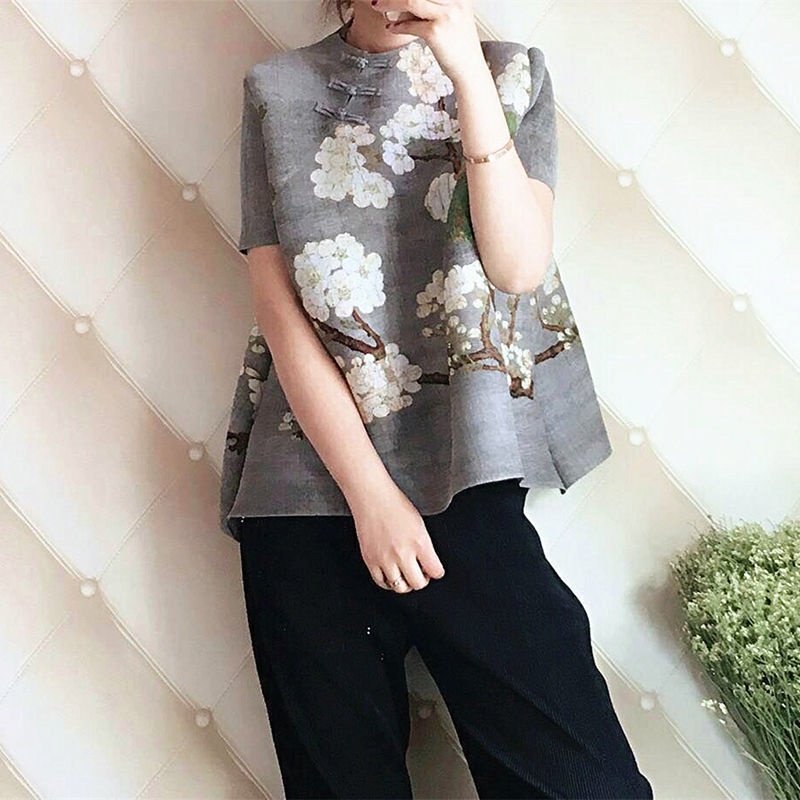 Celebrity Pleated Clothes~National Style Printed Pleated Top Women 2026 Summer New Style Fashion Loose Slimmer Look Cover Flesh Short-Sleeved T-Shirt ins