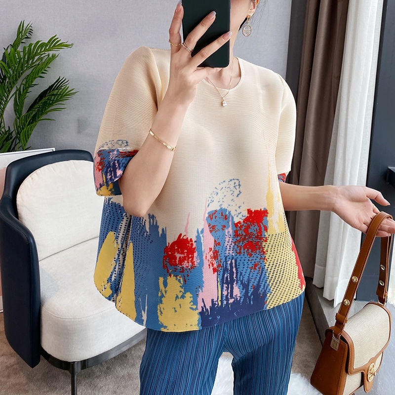 Celebrity Pleated Clothes~Pleated Classical Printed Short-Sleeved Top 2025 Summer New Style Fashionable Round Neck All-Match T-Shirt ins