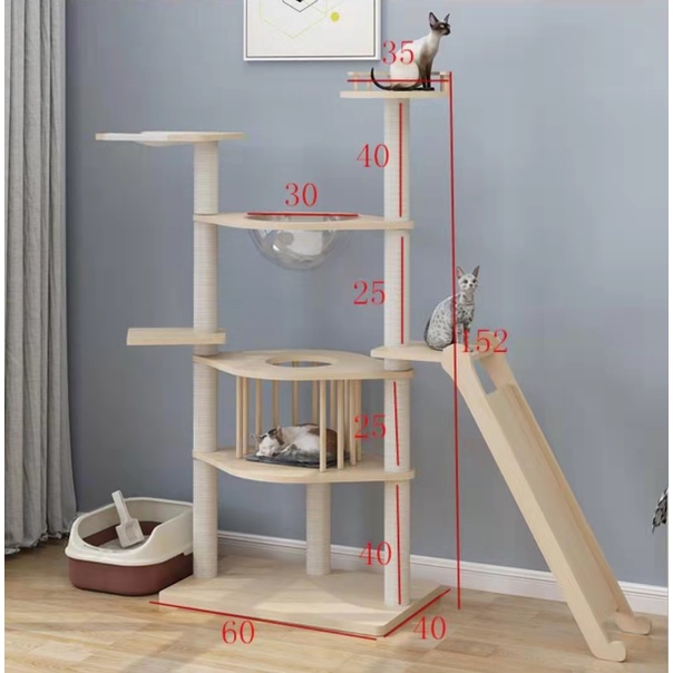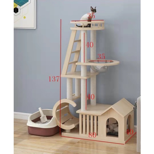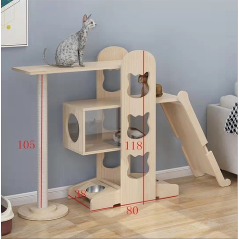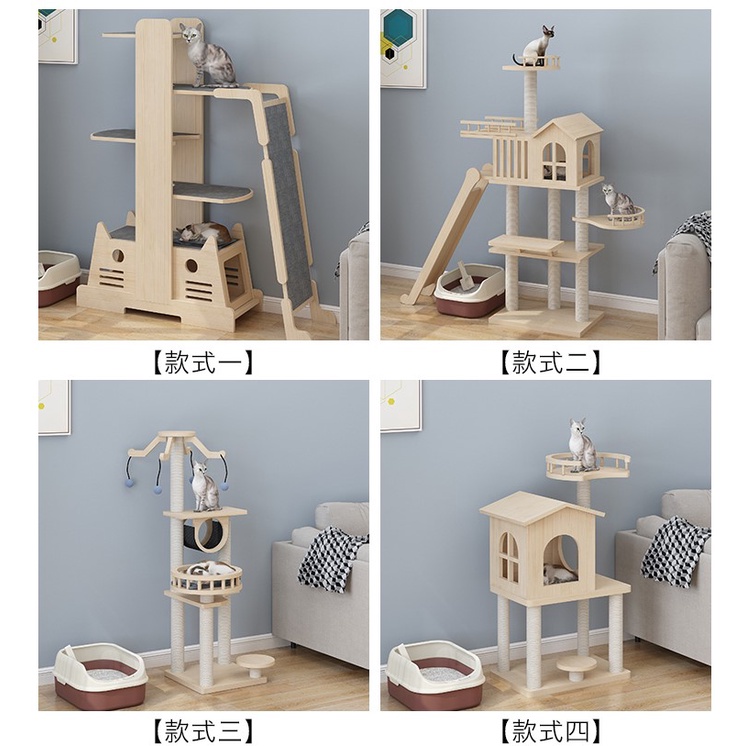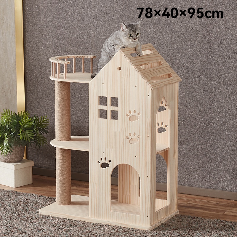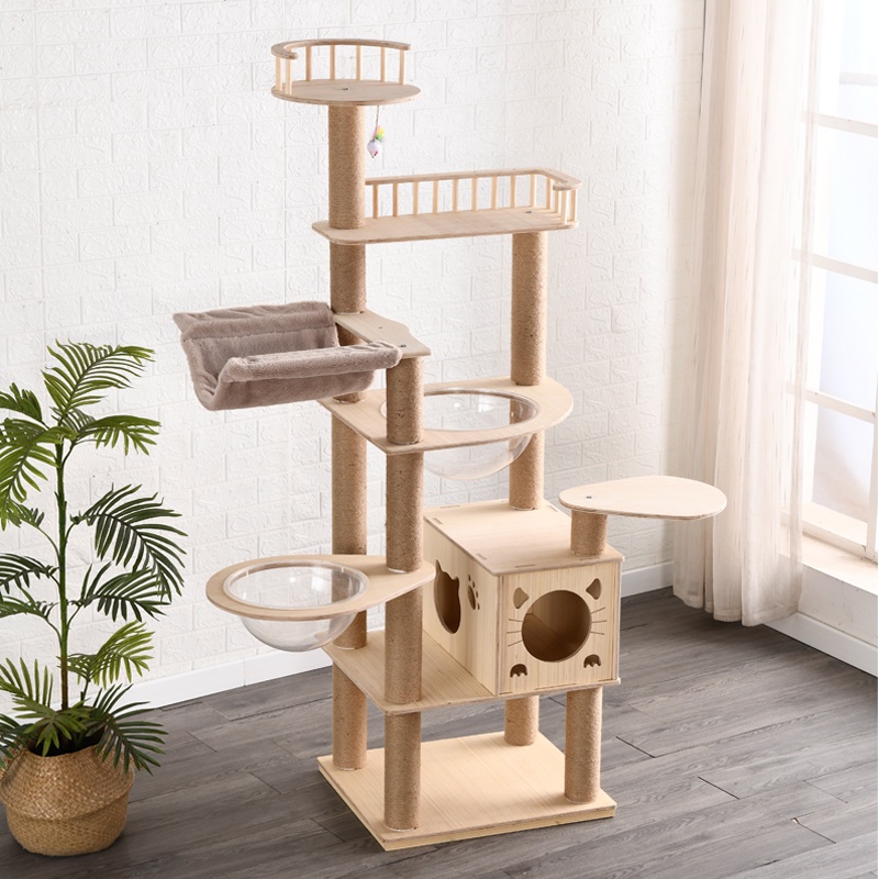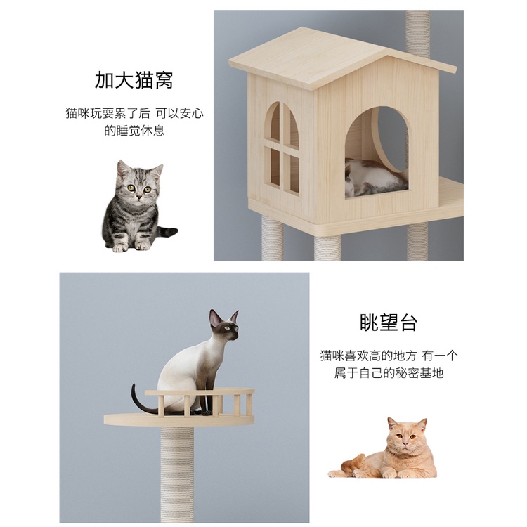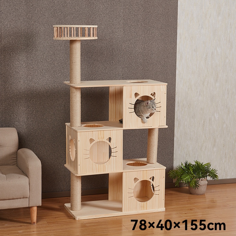 Condo Solid Wood Tree House Cat Scratching Post Tower With Column Platform Nest Multi-layer Villa