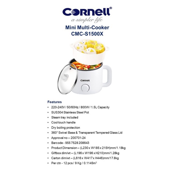 Cornell 1.5L Mini Multi-Cooker Personal Steamboat Noodle Cooker CMC-S1500X