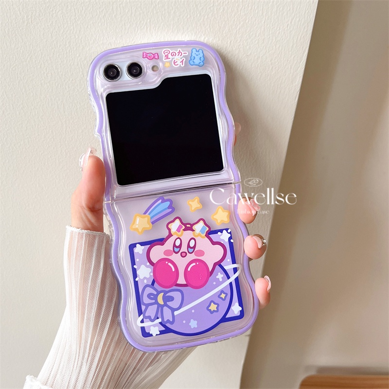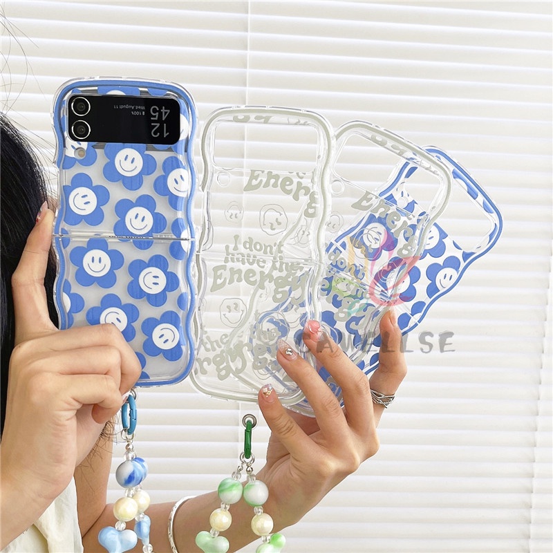 Curly Wave Frame Soft Clear Silicone Phone Case with Beads Wrist Strap Samsung Galaxy Z Flip 5 Z Flip 4 Z Flip 3 Printed TPU Wavy Edge Casing with Bracelet Transparent Cover