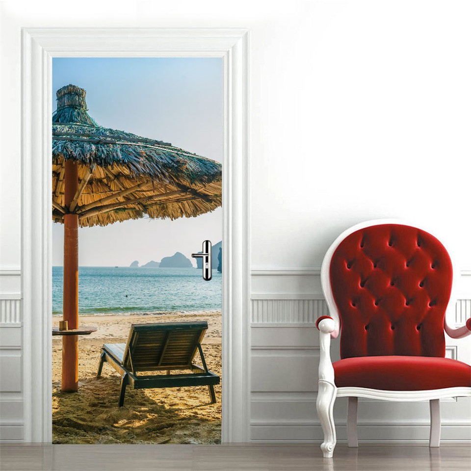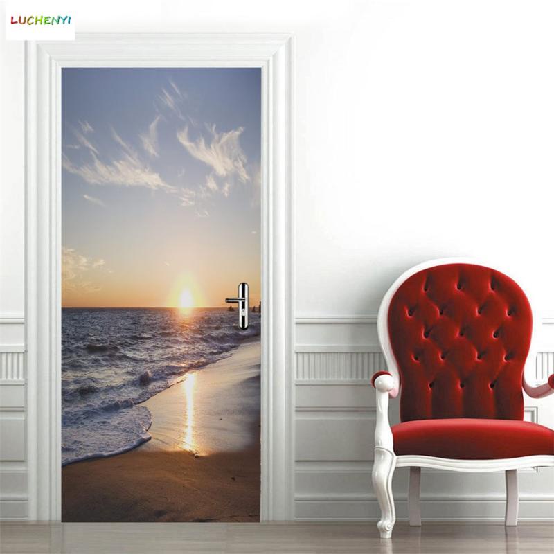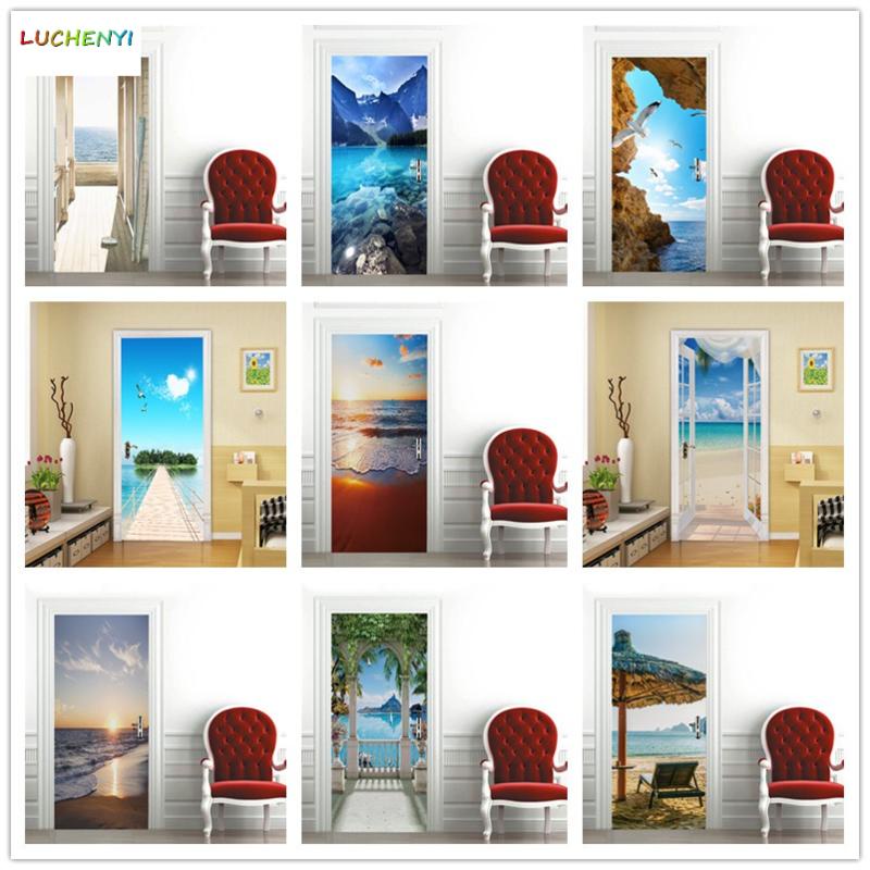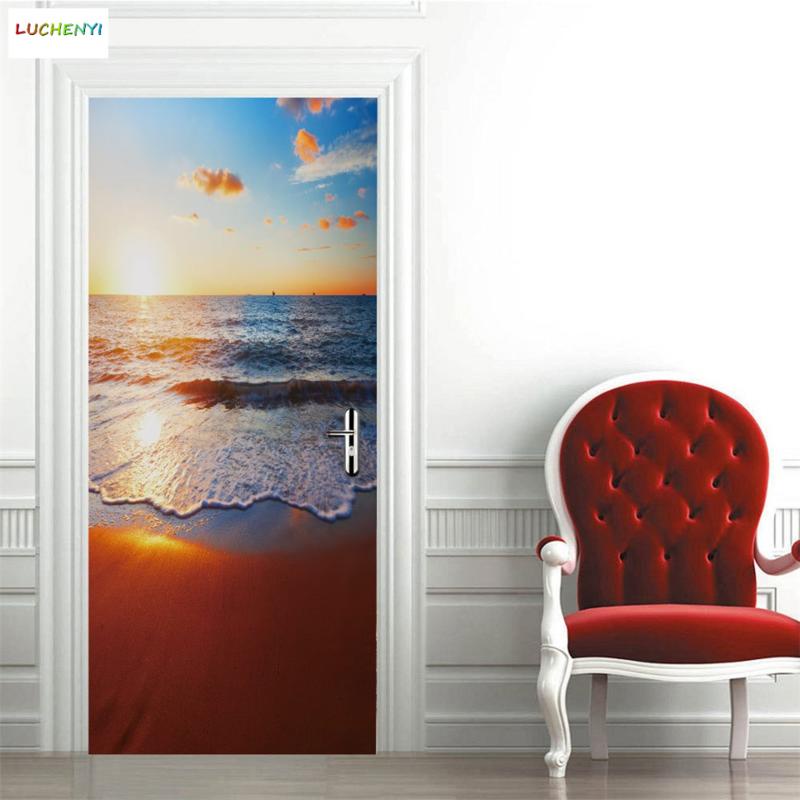 Custom 3D Wallpaper For Door Sticker Self-adhesive DIY Poster Beach Sea Scenery Mural Home Design Door Decoration Decal fridge stickers