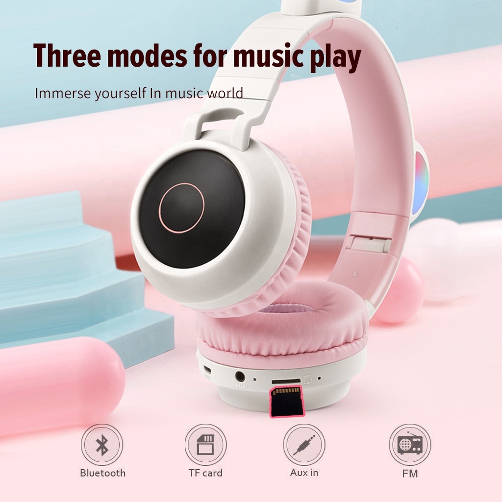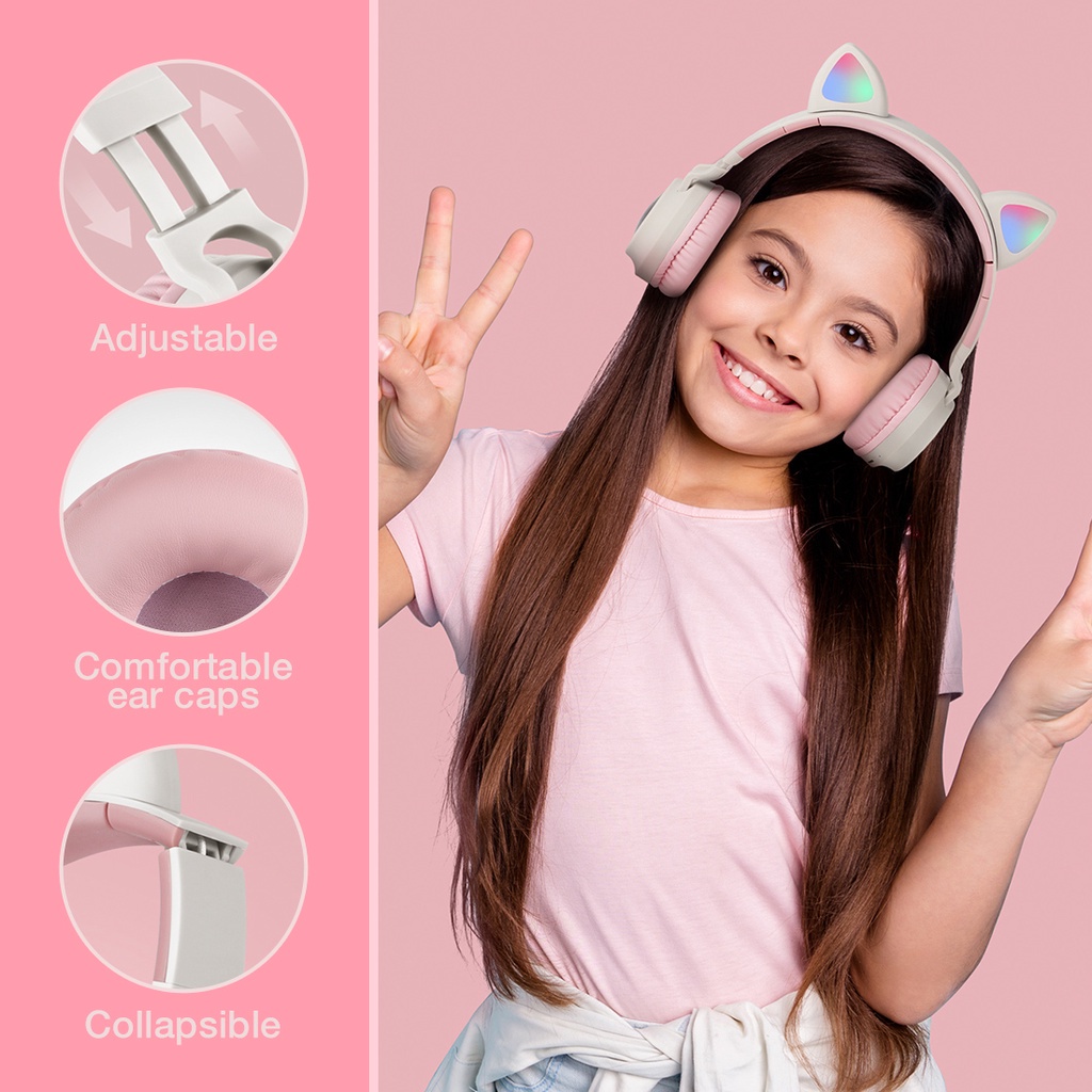 Cute Cat Headphones Bluetooth 5.0 Cat Earphone Foldable On-Ear Wireless Headset with Mic, LED Light, Volume Control
