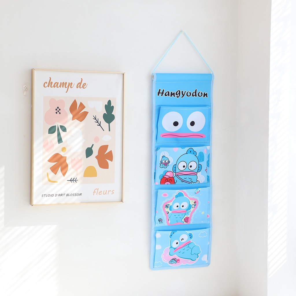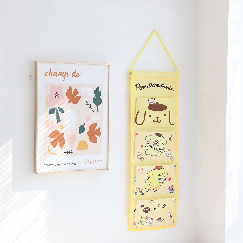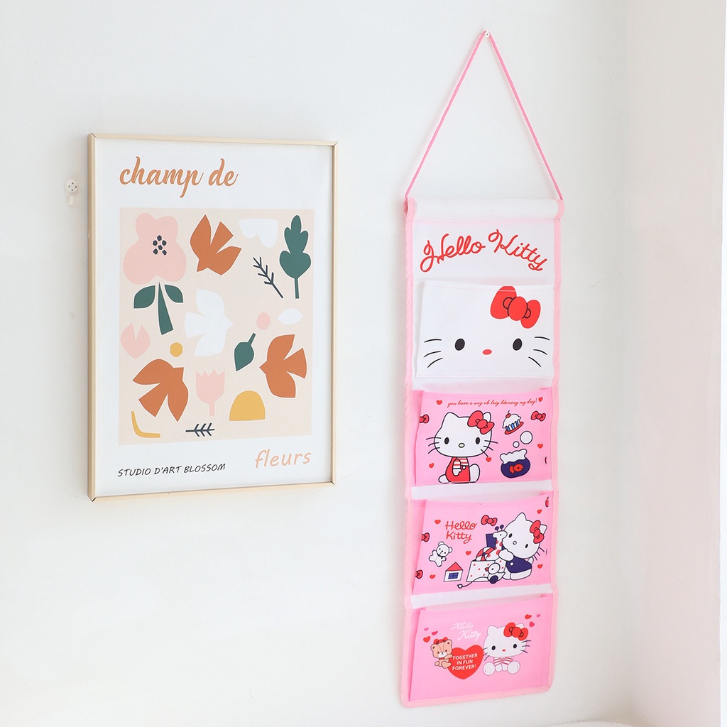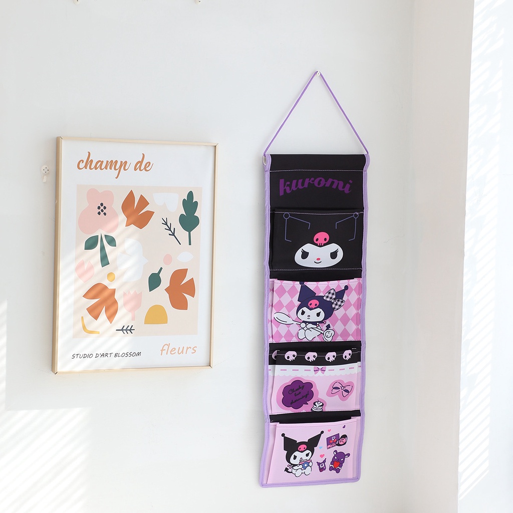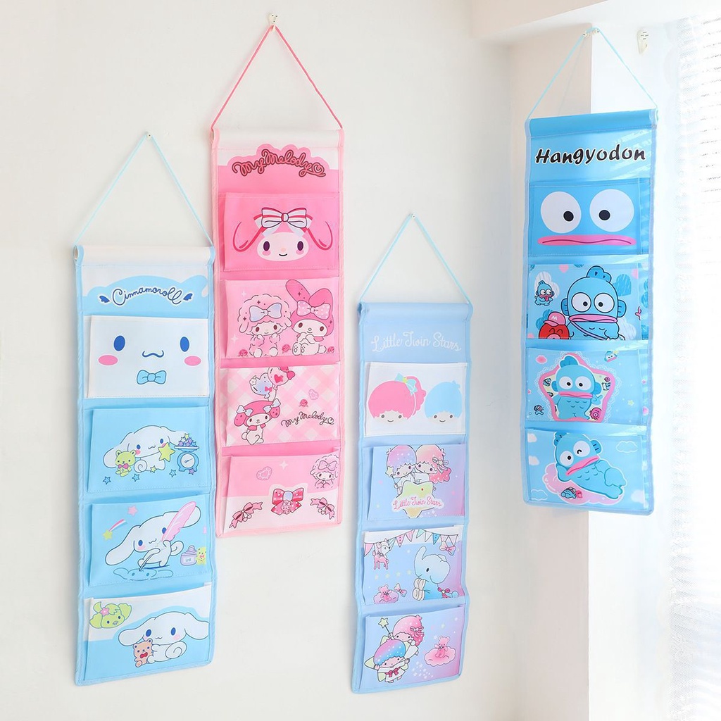 Cute Hanging Storage Bag Cartoon Long 4-Grid Hanging Bag Wall-Mounted Storage Bag Cotton Linen Kuromi Melody Hanging Pocket Balcony Hanging Storage Bag
