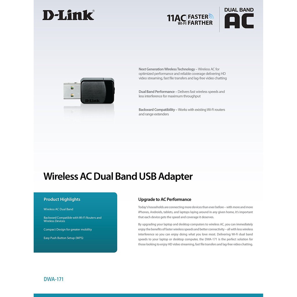 D-Link DWA-171 Wireless AC600 MU-MIMO Wi-Fi Dual-Band Nano USB Adapter (3-Yrs Sg Wty)