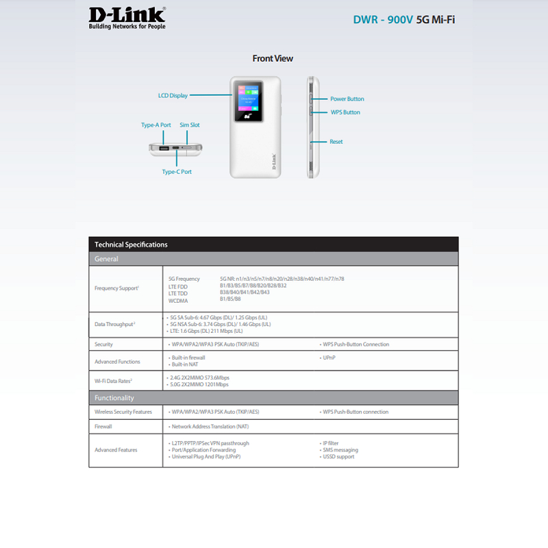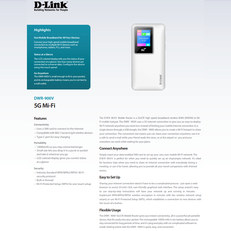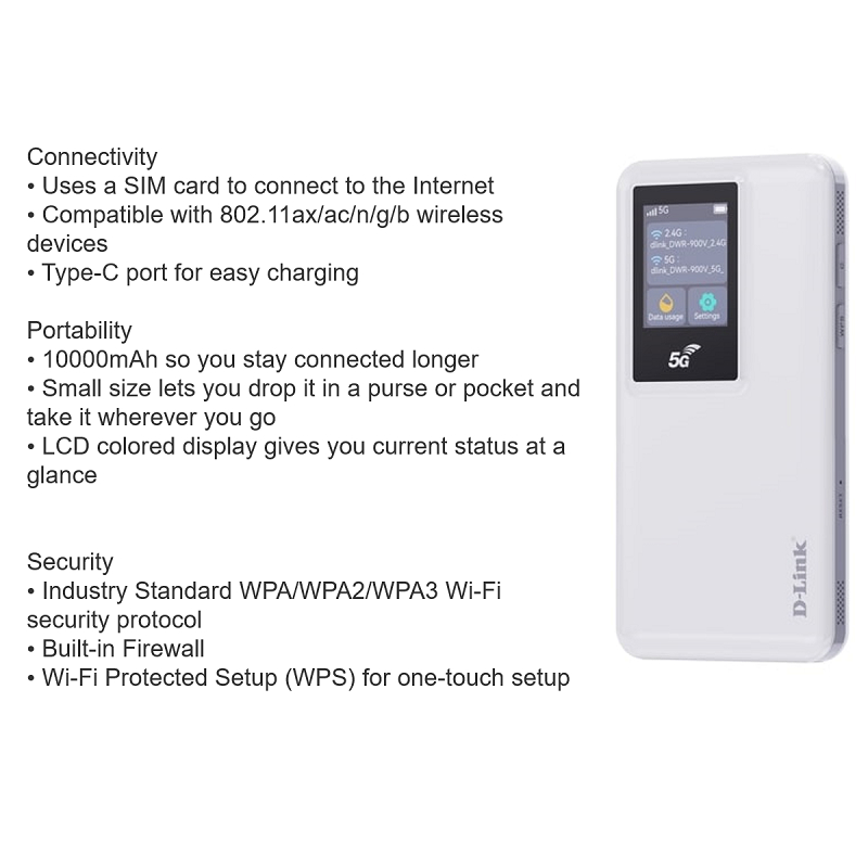 D-Link Wifi 6 DWR-900V 5G Router MiFi Mobile 5G Sim Card Router with Rechargeable 10000 mAh Li-ion battery (Type-C port)