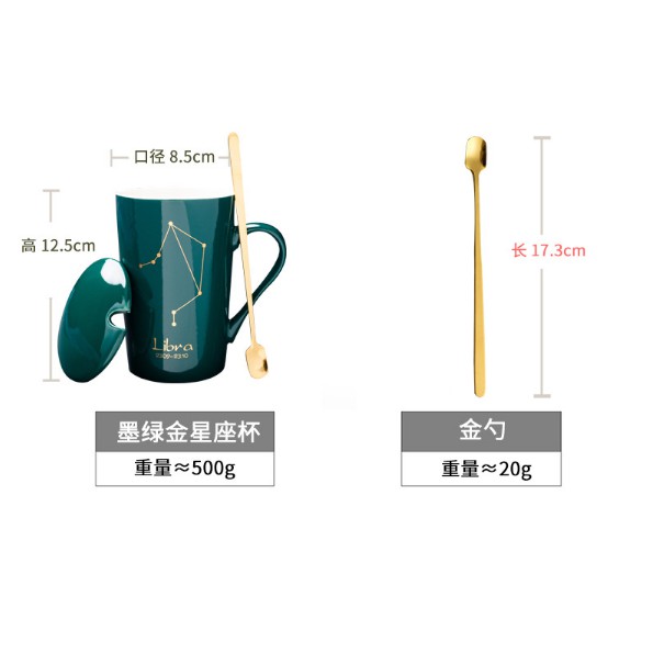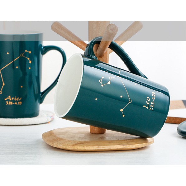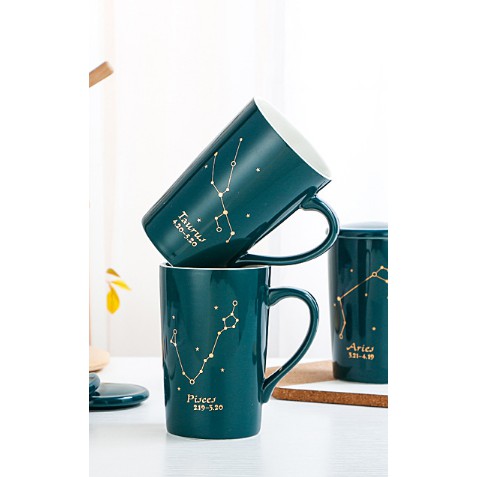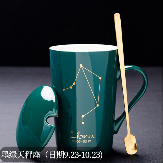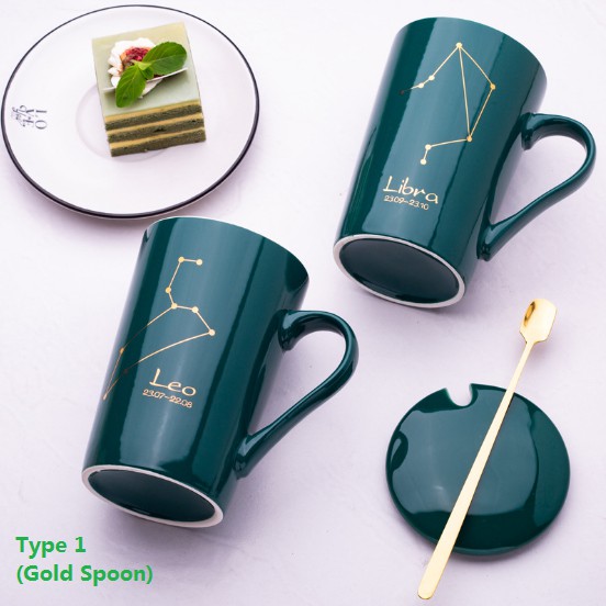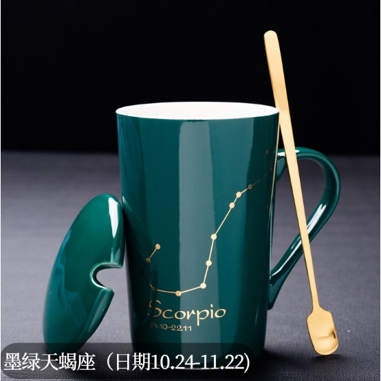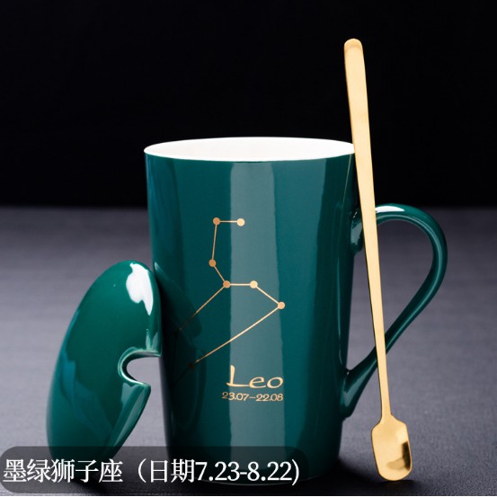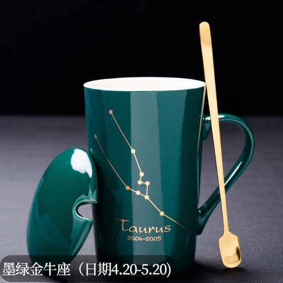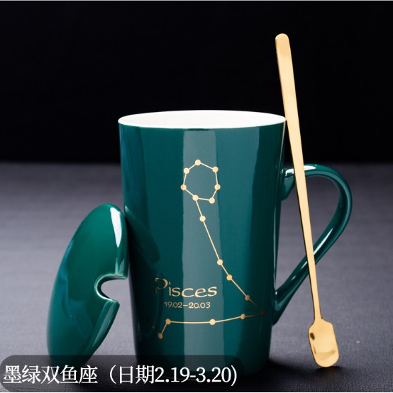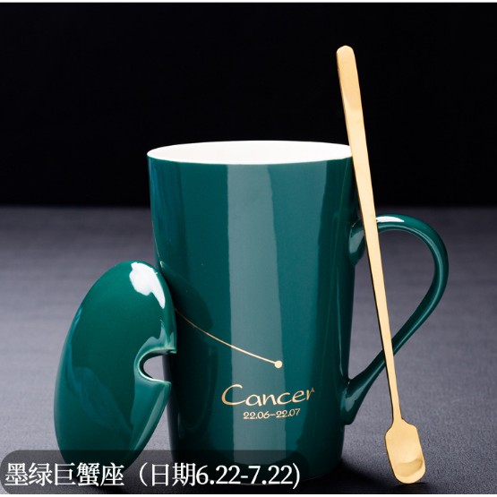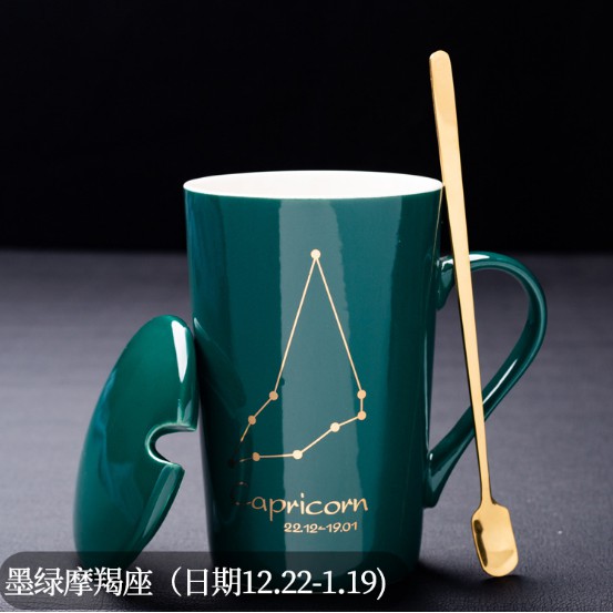 Dark Green Color Horoscope Ceramic Mug / Cup (with Lid and Spoon) Pack / Set
