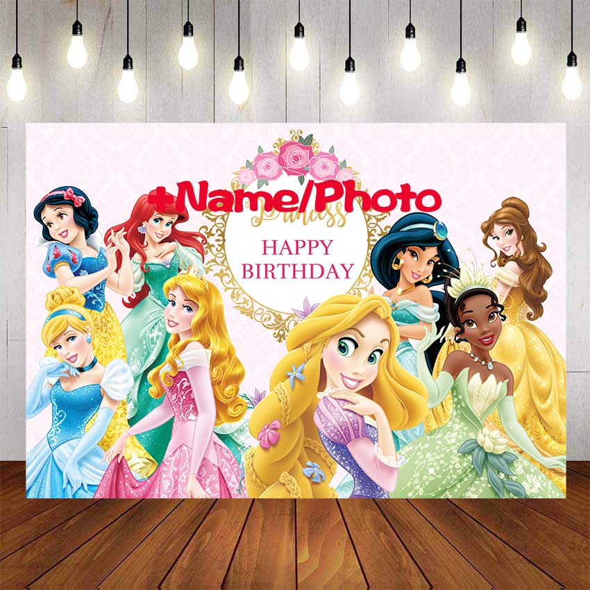 Disney Princesses Backdrop For Photography Baby Shower Kids Birthday Pink Princess Background Birthday Party Decor Custom Name Photo