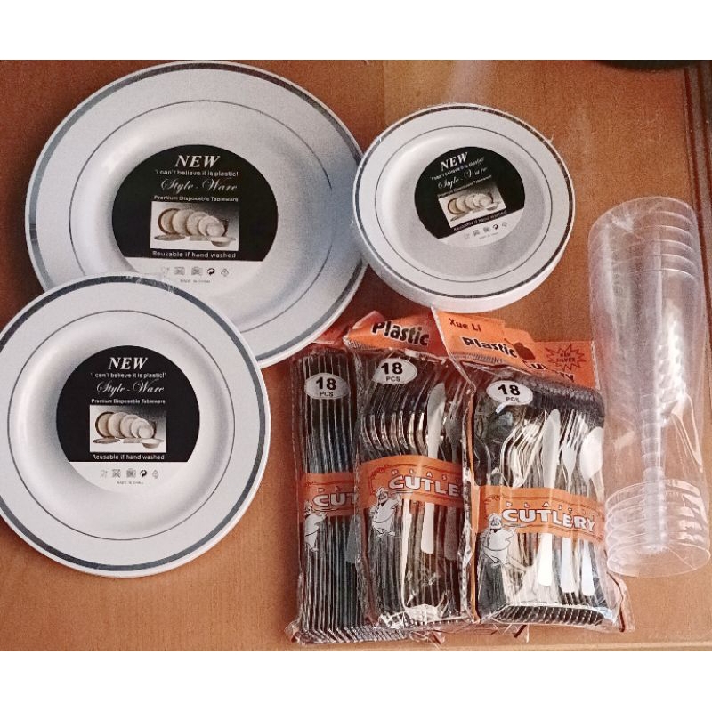 Disposable Plastic Plates, Cups, Bowls, Fork, Spoon, Table Cloth, Cutleries