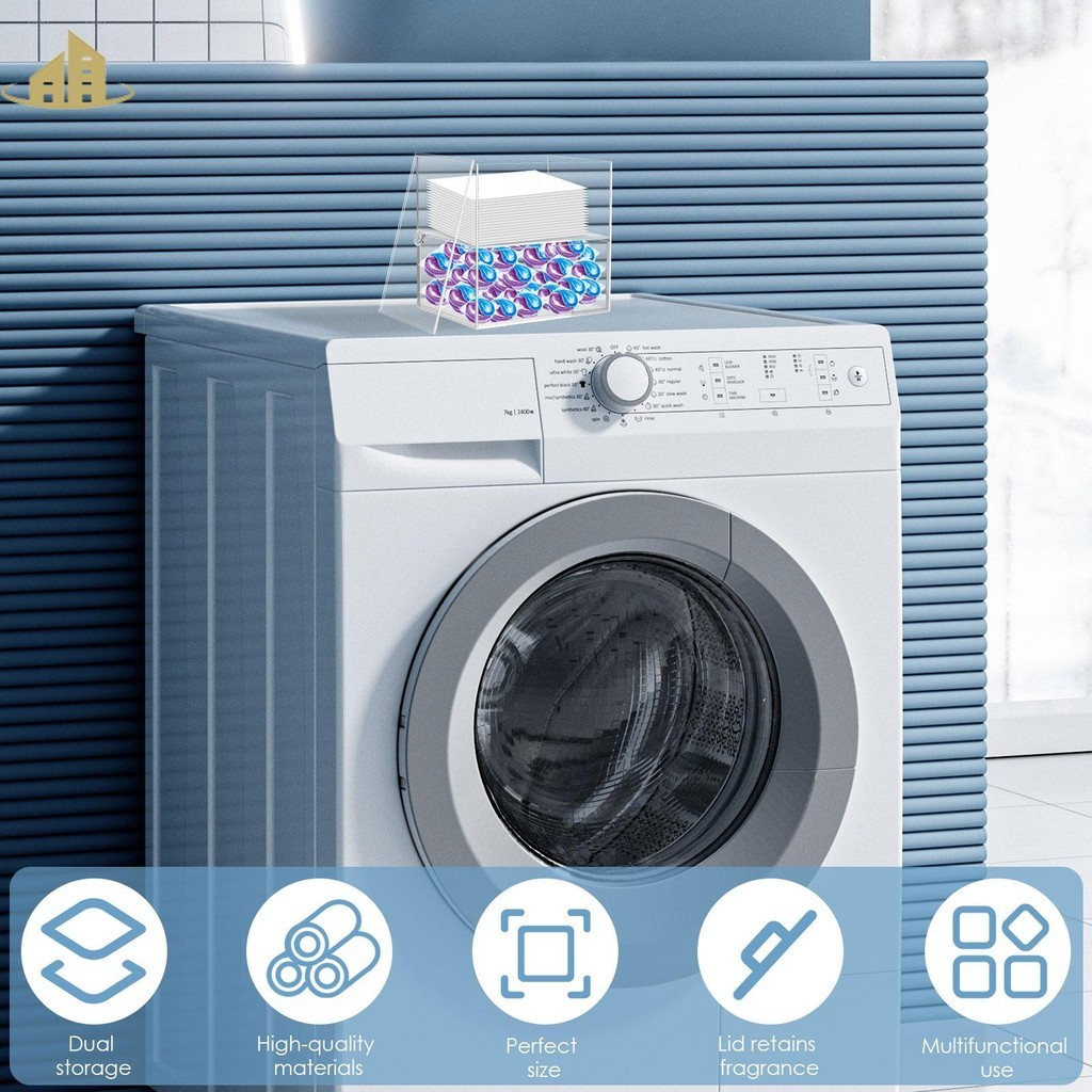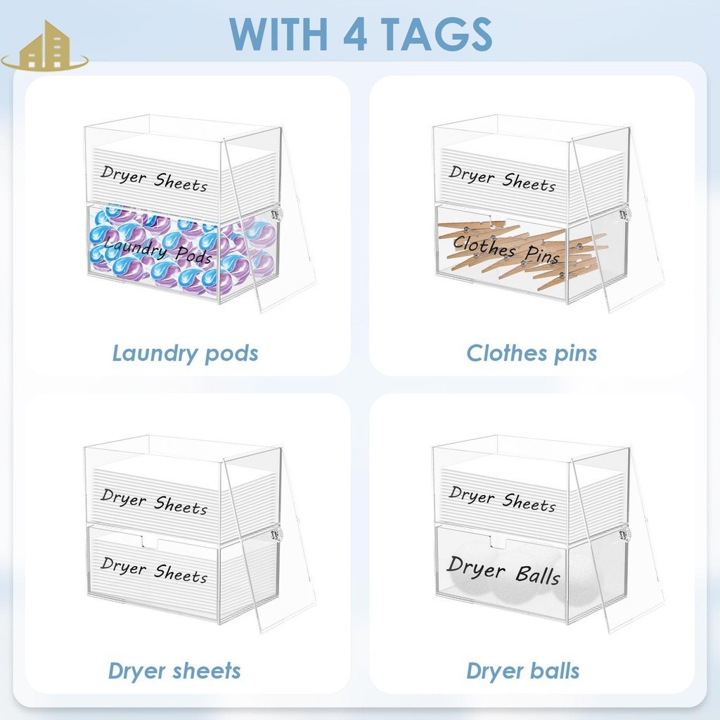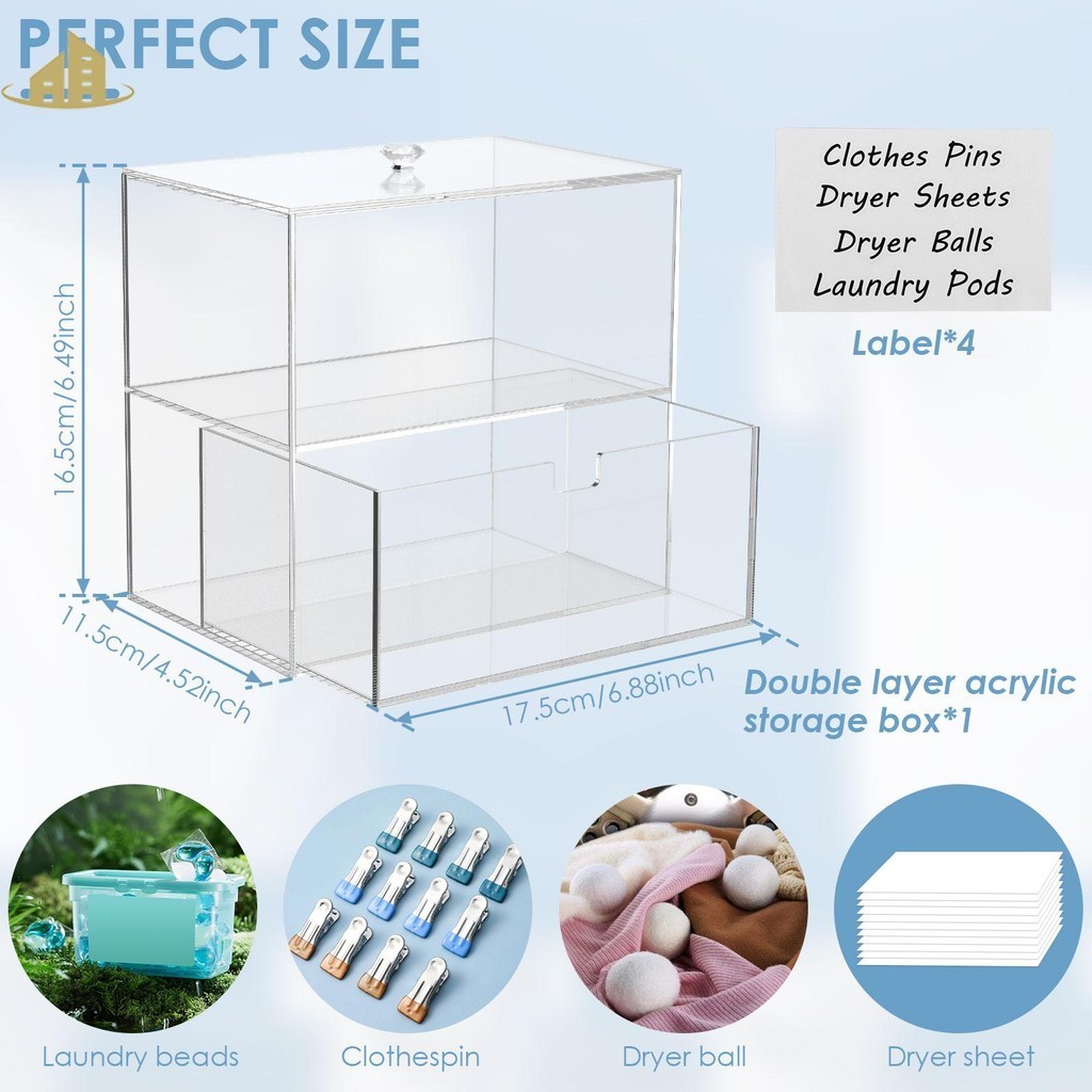Dryer Sheet Holder with Drawer and Lid Acrylic Dryer Sheet Container 2-Tier Laundry Pod Container with 4 Label Decals Clear Dryer Sheet Laundry Pods Container Box SHOPSBC2246