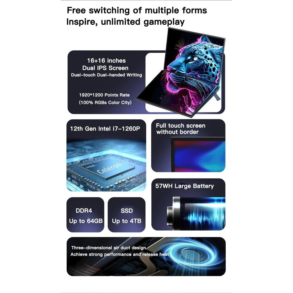 Dual Touch Screen Laptop 16 inch Portable Notebook i7-1260P DDR4 M.2 SSD Windows 11 Pro Notebook Tablet PC 2 in 1