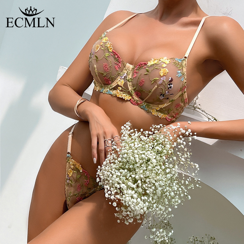 ECMLN Women Transparent Sexy Lace Bra Set Underwired Bras Thin Female Pure Desire Underwear Floral Thong Sexy Lingerie Set