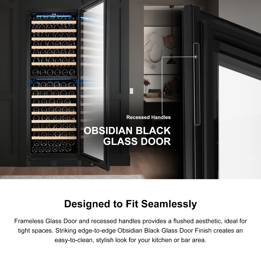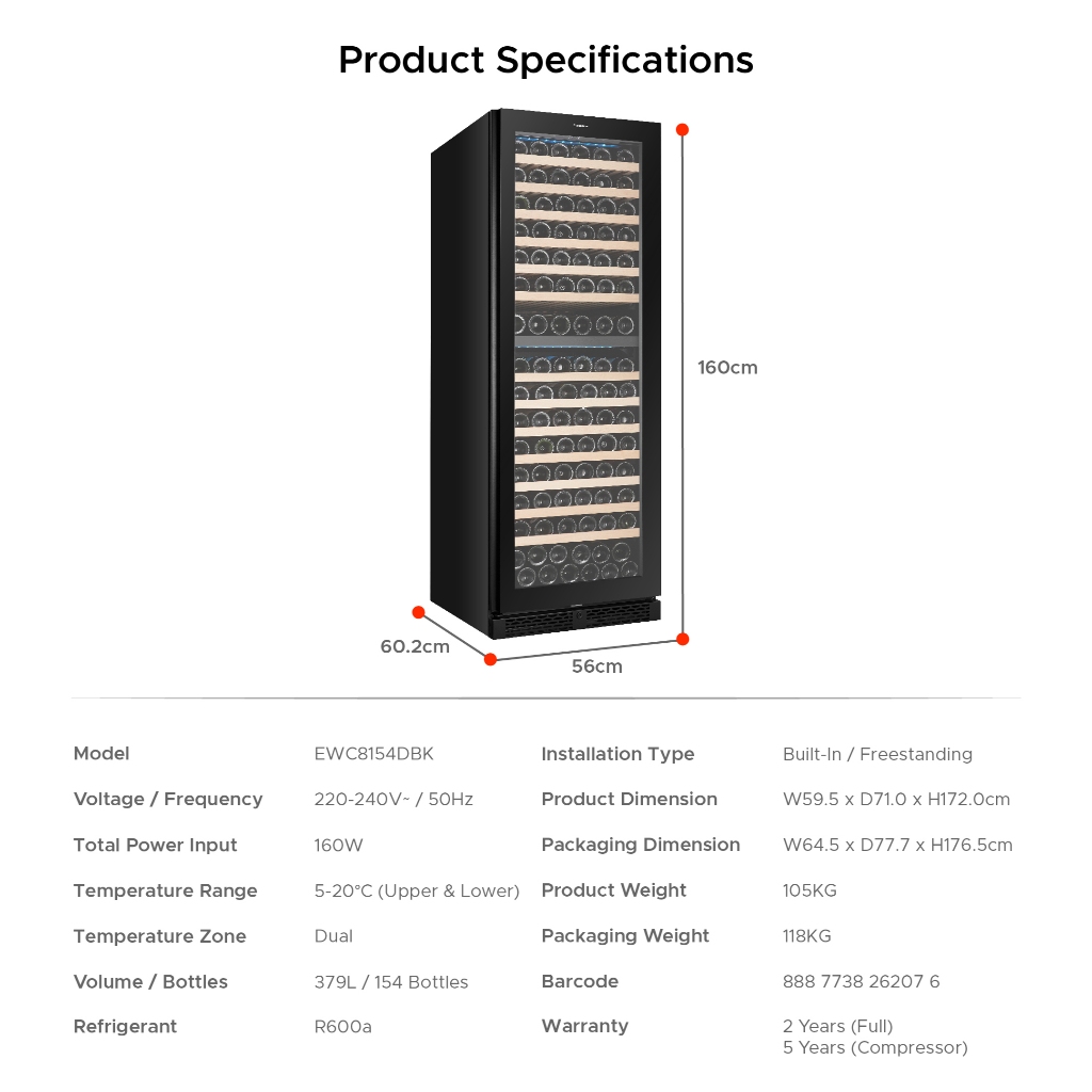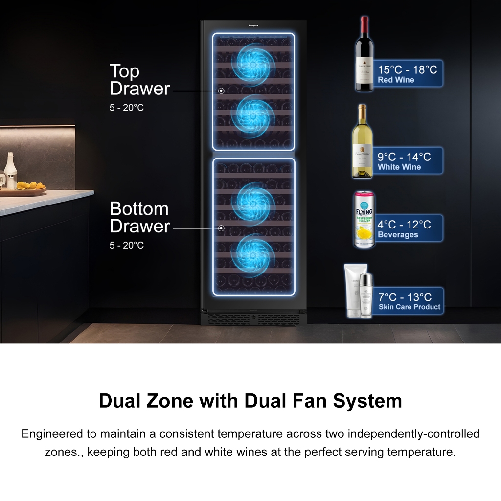 EuropAce 154 Bottles Wine Chiller | EWC8154DBK | Dual Zone with Dual Fan System, 3 Layered Glassdoor, Recessed Handles