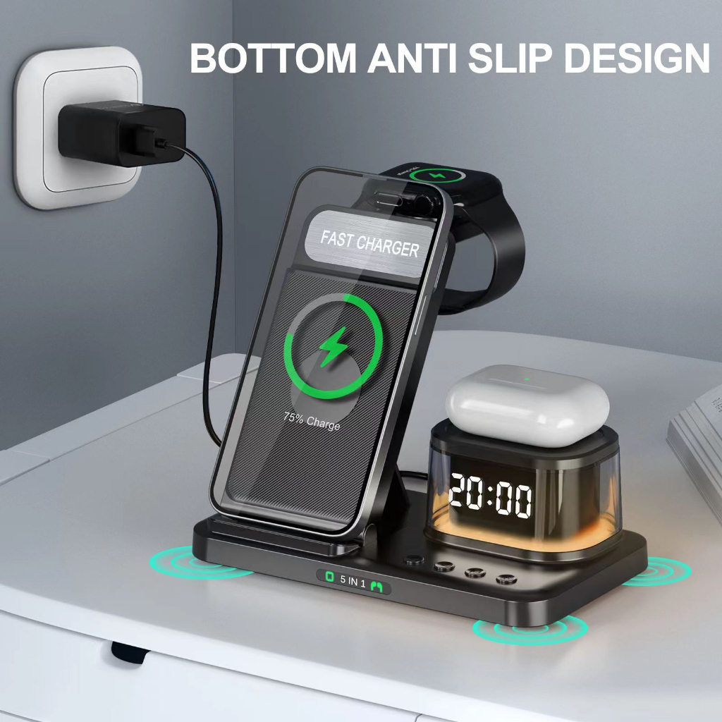 Folding 5-in-1 clock night light wireless charger phone watch headphone multifunctional charging stand