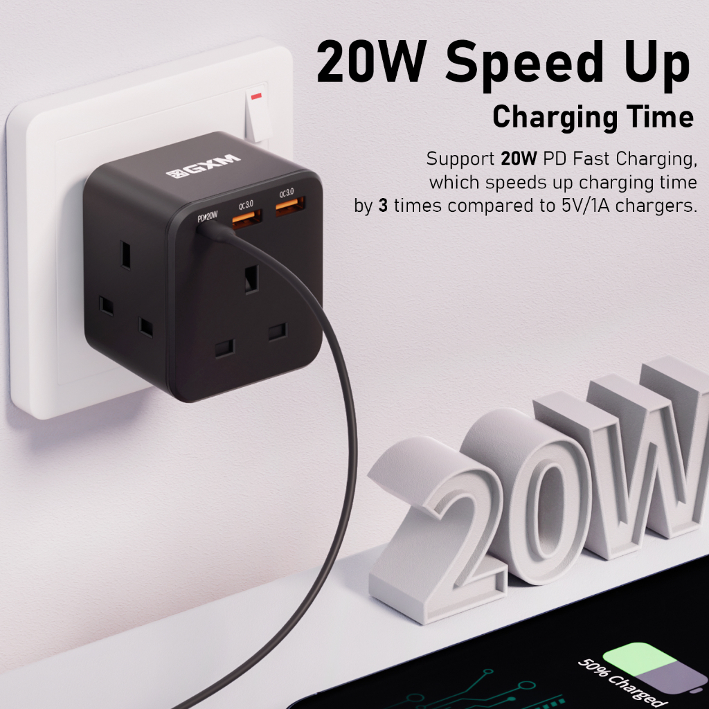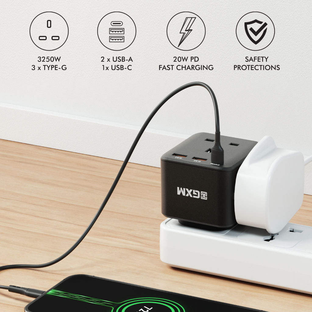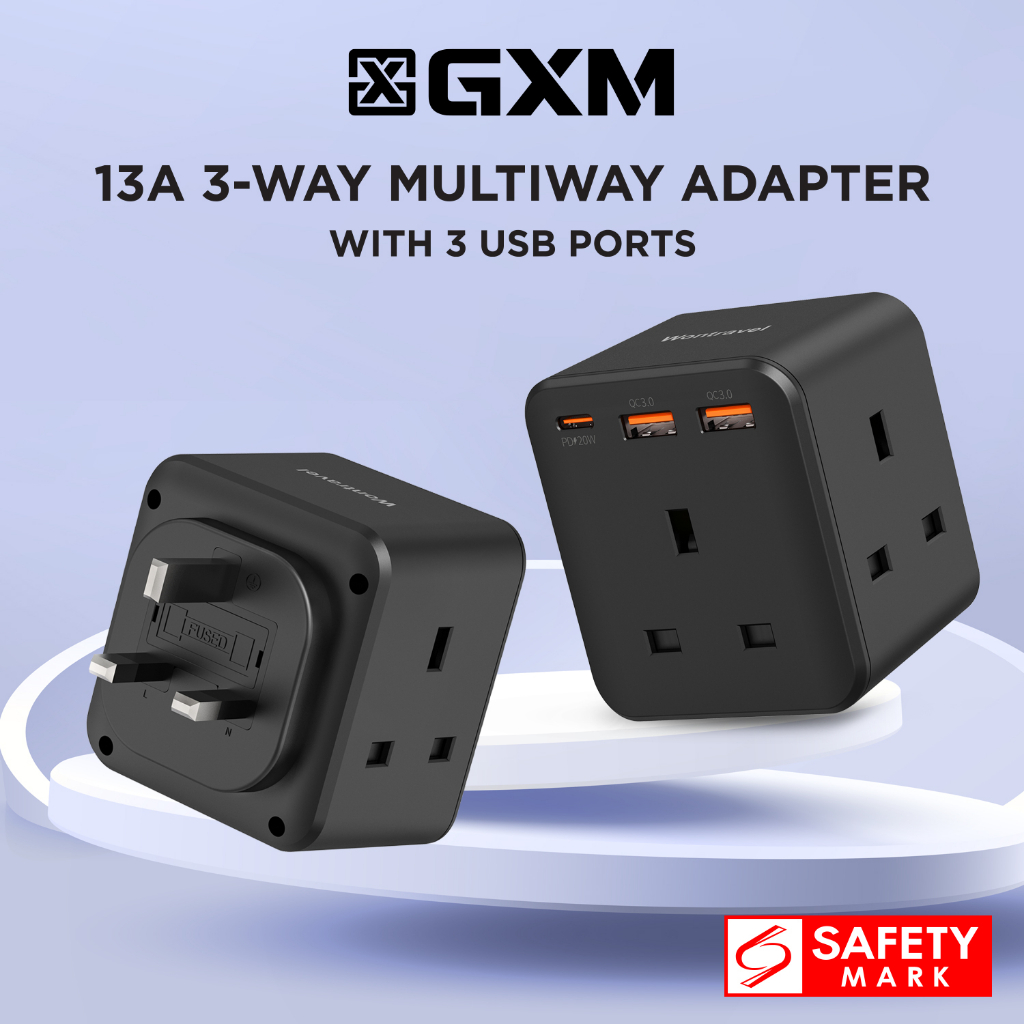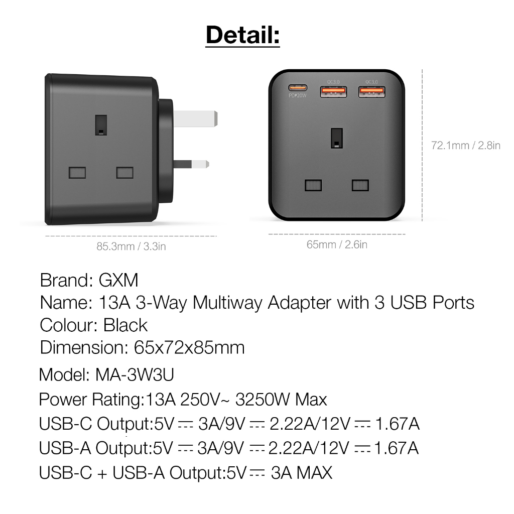 GXM 20W 13A 3-Way Safety Mark Multiway Adapter Wall Charger with 3 USB Ports Type-C USB
