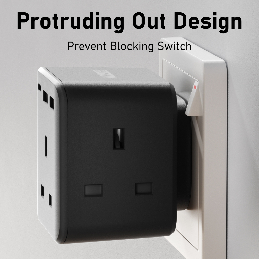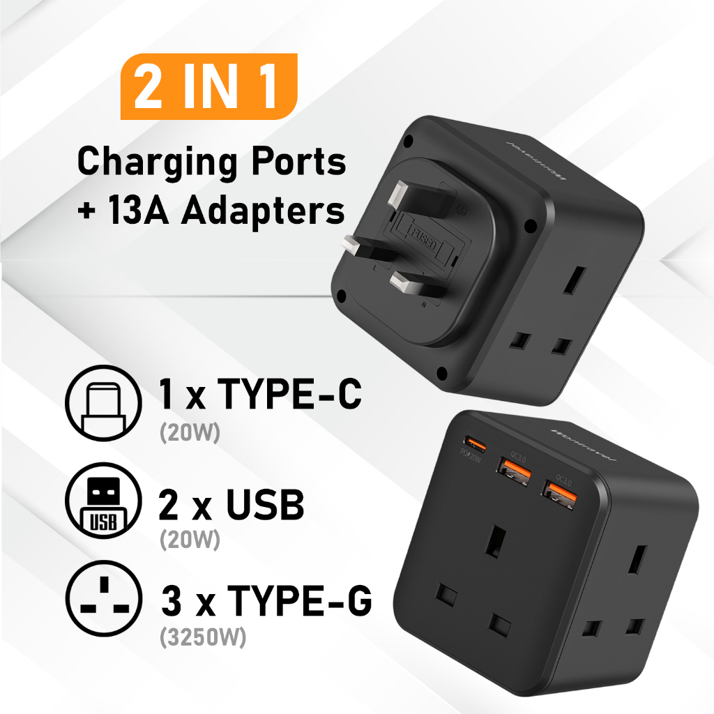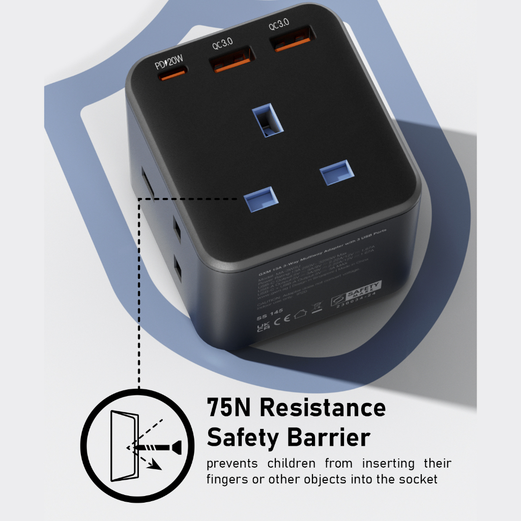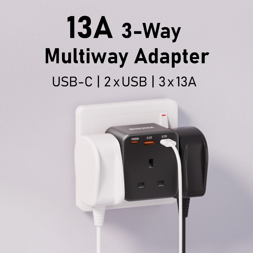 GXM 20W 13A 3-Way Safety Mark Multiway Adapter Wall Charger with 3 USB Ports Type-C USB