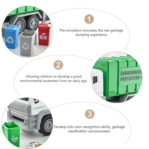Garbage Truck Toy Waste Recycling Truck Toy Set with 4 Trash Cans, Back Bump Function, Lights & Sounds