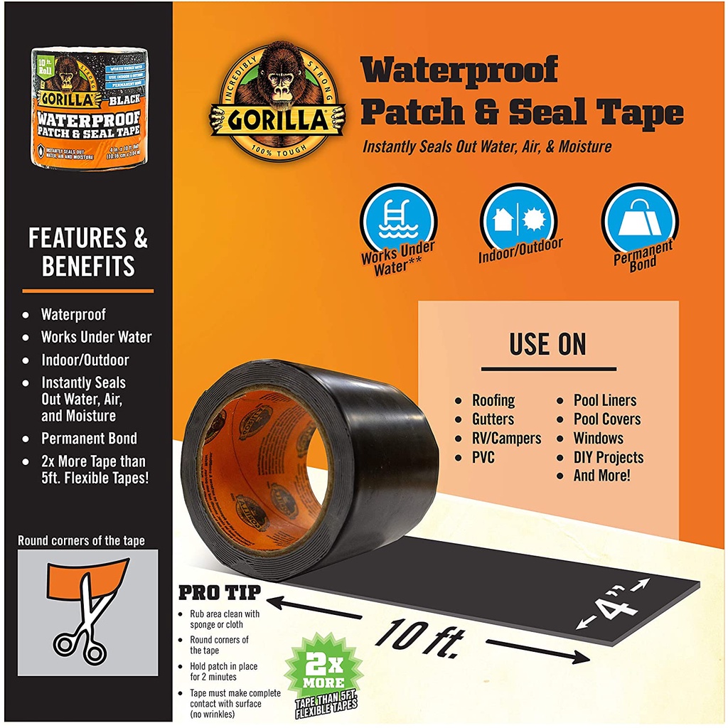 Gorilla Waterproof Patch & Seal Tape, 3.04 x 0.1 m, Black/White/Clear