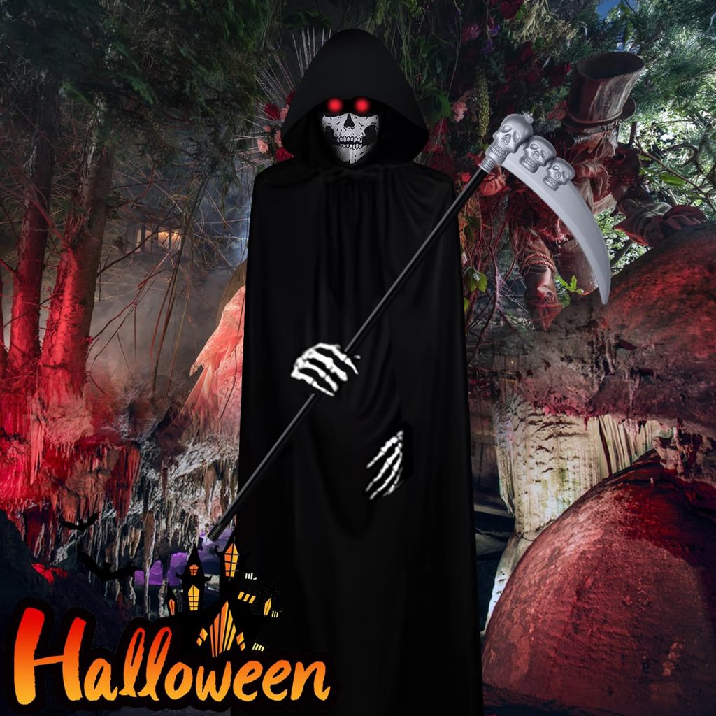 Grim Reaper Costume for Kids Adult, Final Destination Grim Reaper Cloak Hoodie for Scary Halloween Cosplay Costume Props with Skull Mask, Death Scythe, Skeleton Gloves