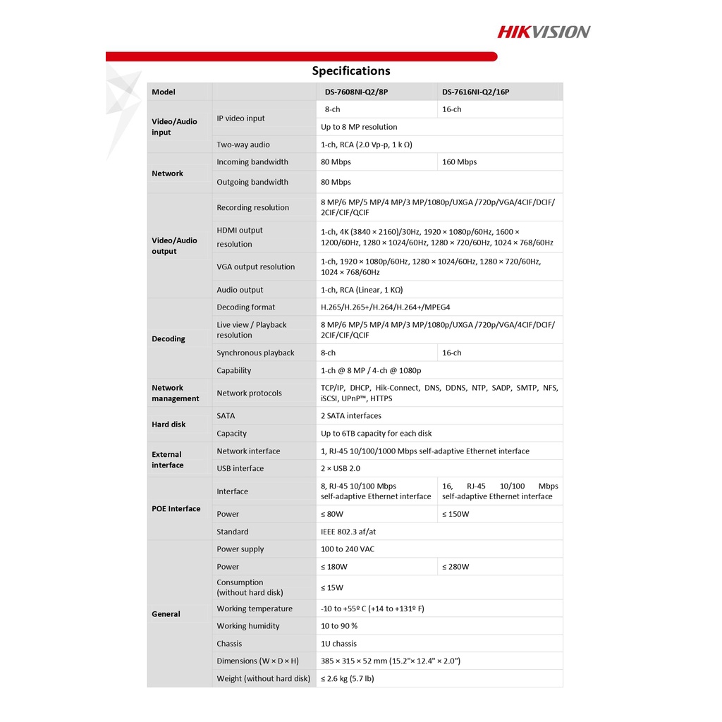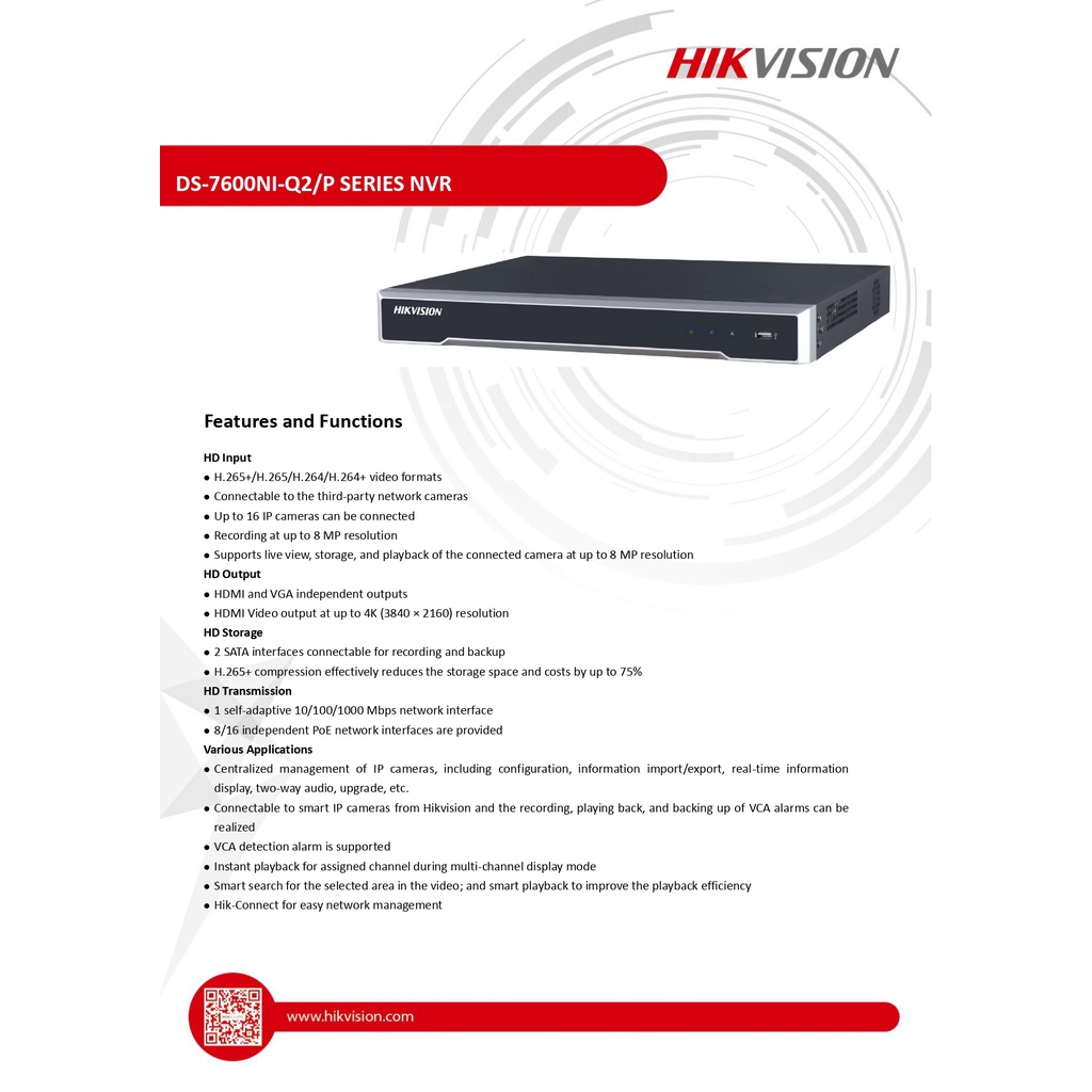 HIKVISION 16 Channel NVR Camera - [ Model: DS-7616NI-Q2/16P] CCTV Embedded Plug & Play 4K NVR [PC-Mobile App:Hik-Connect
