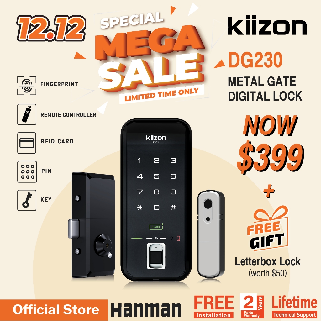 KiiZON DG230 METAL GATE DIGITAL LOCK. FINGERPRINT/CARD/PIN/KEY+REMOTE CONTROLLER(FREE INSTALLATION+2 YEAR PART WARRANTY)