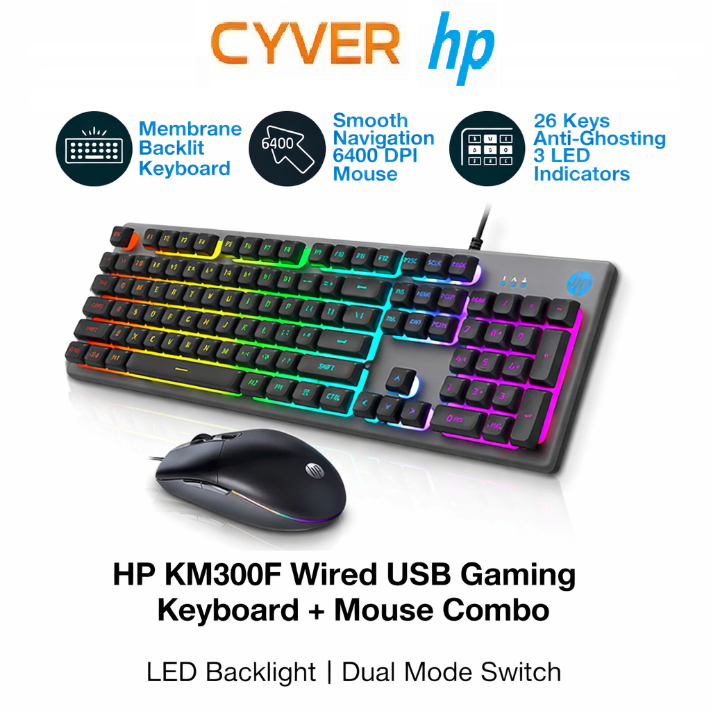 HP KM300F WIRED USB GAMING KEYBOARD AND MOUSE COMBO WITH LED BACKLIGHT KEYBOARD AND DUAL MODE SWITCHING