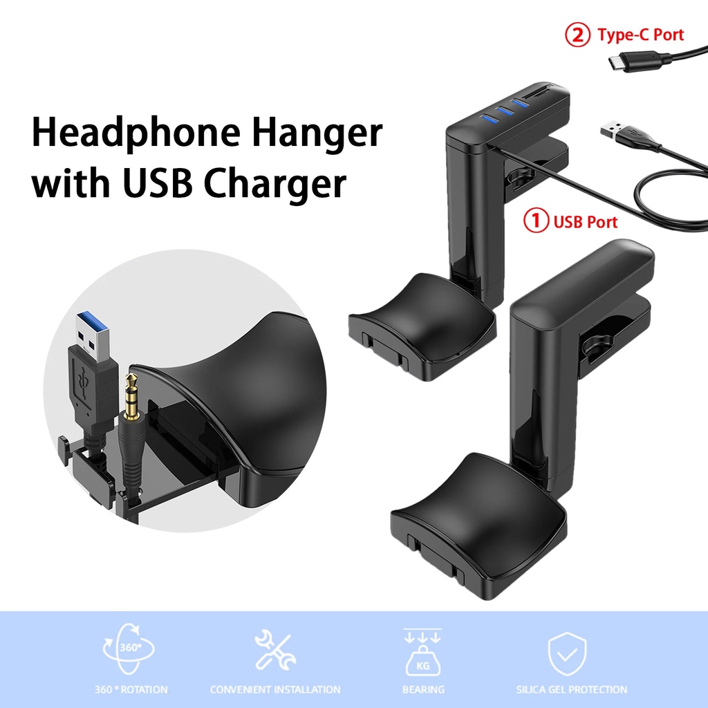 Headphone Bracket Swivel Mounted PC USB Ports Gaming Headset Stand Holder Under Desk Hanger Hook Earphones Display Stand