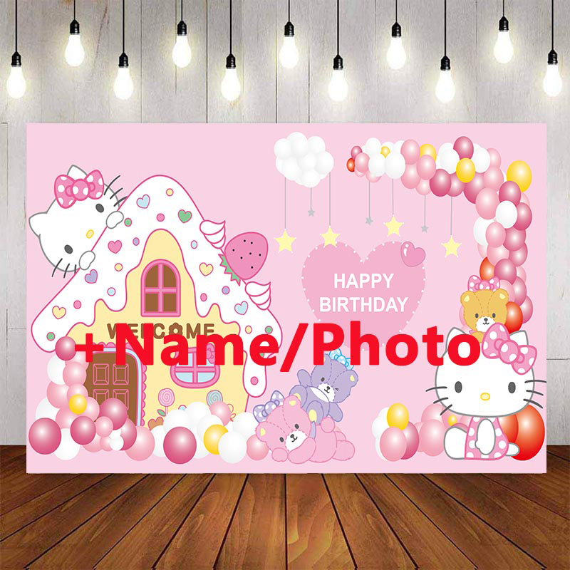 Hello Kitty Backdrop For Photography Baby Shower Kids Girls Cartoon Background Birthday Party Decor Custom Name Photo