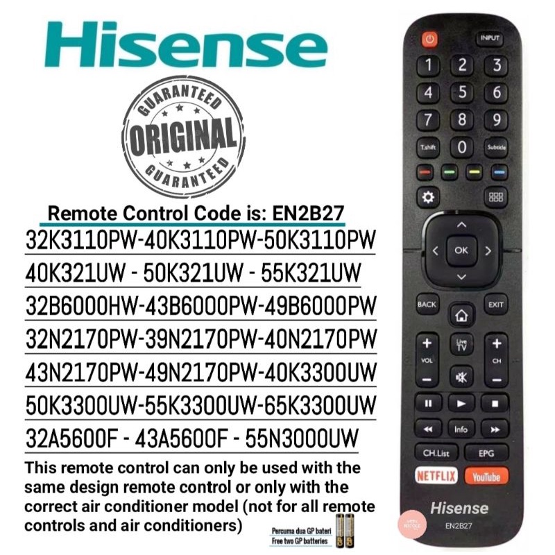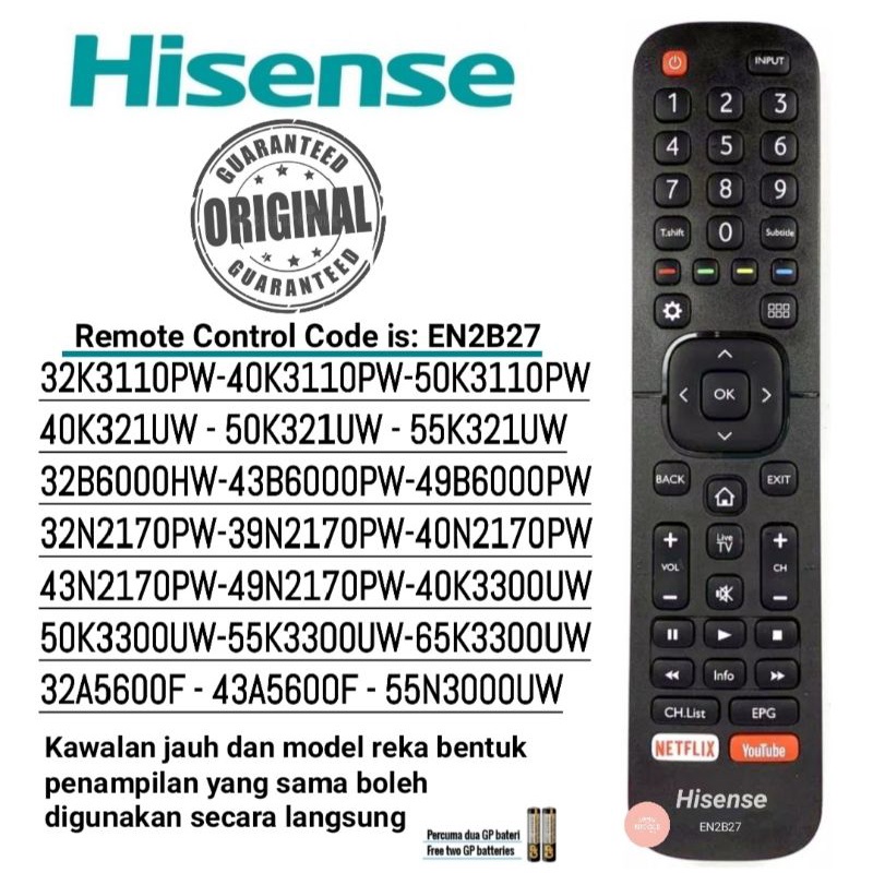 Hisense EN2B27 Smart Led Flat Panel TV Remote Control with Youtube Netflix