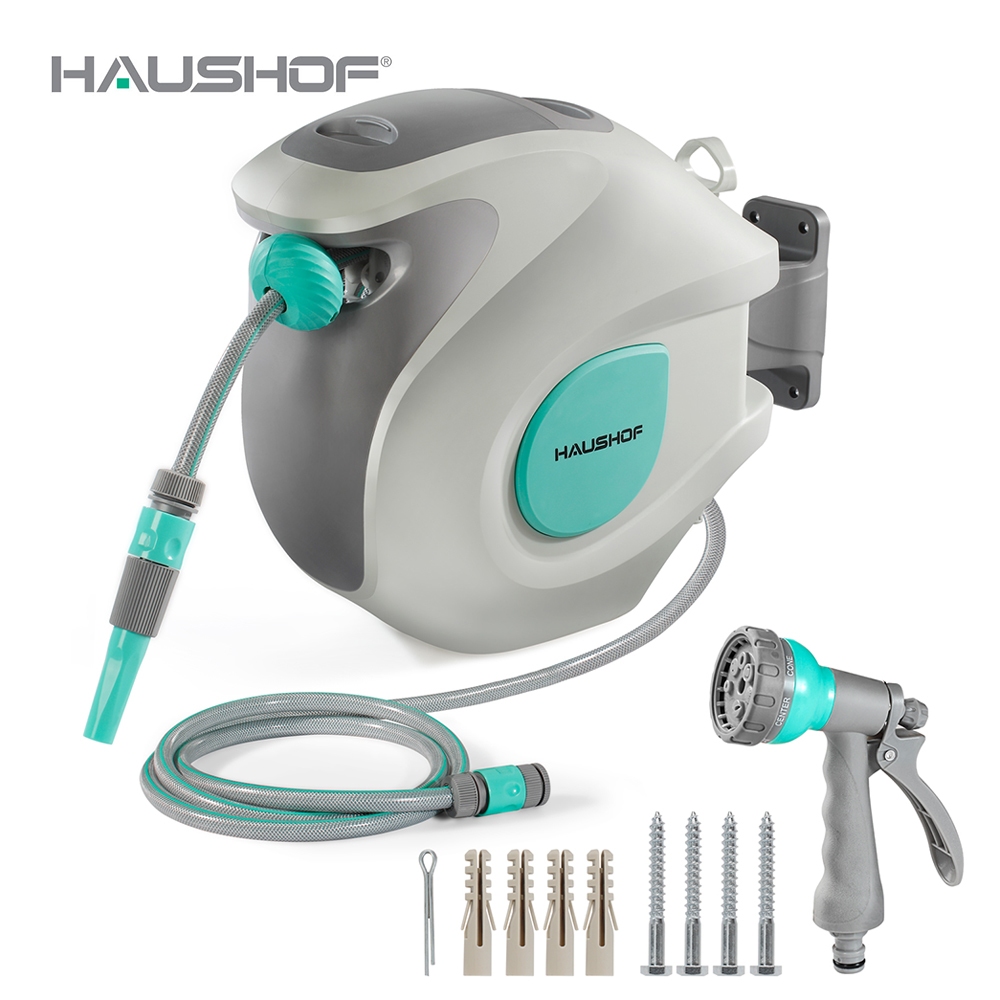Hose Reel Wall Mounted Retractable Garden with 20+2M Hose Locking Mechanism Roll-up Automatic 7 in 1 Spray Guns 180 Degrees Swiveling