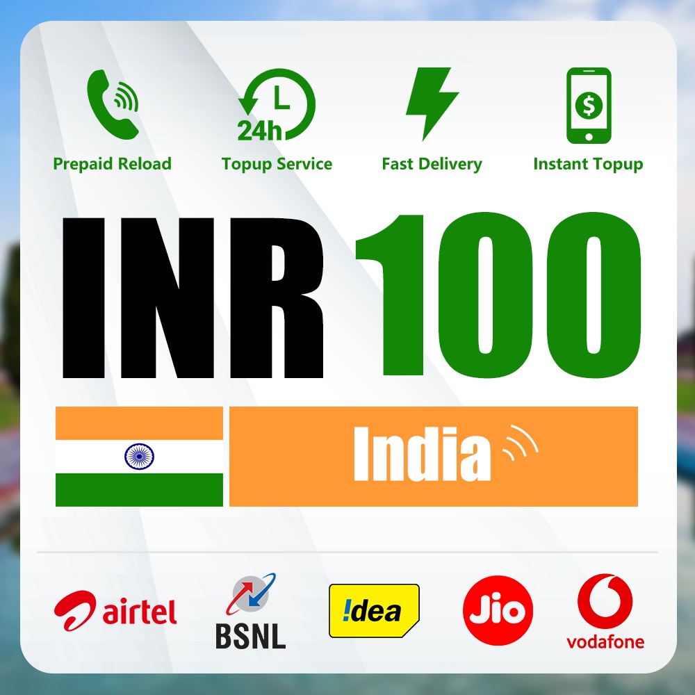 India INR 100 Topup Prepaid Reload [Click in the Email/SMS to topup Fast and Instant] (Telco Prepaid/Prepaid Phone)