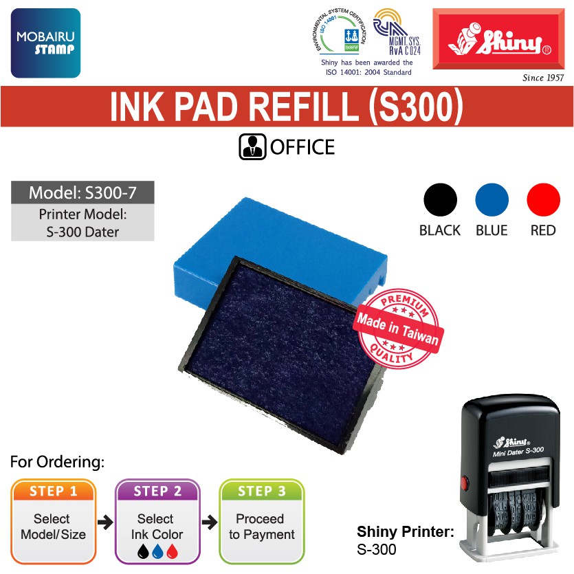 Ink Pad/Cartridges Refill for Self Inking Stamps - Shiny Dater Printer S-300 (Black, Blue & Red)