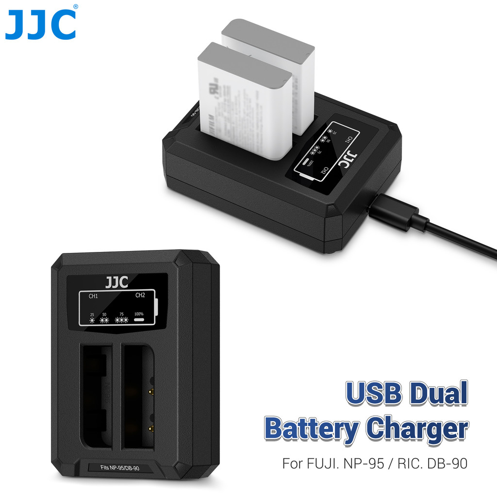 JJC Dual Battery USB Charger for Fuji NP-95 Battery of Camera Fuji Fujifilm X100 X100S X100T X70 X30 X20 XF10 3D W1 X-S1 XF10 F31 F30 & DB-90 of GXR CX6 CX5 CX4 CX3