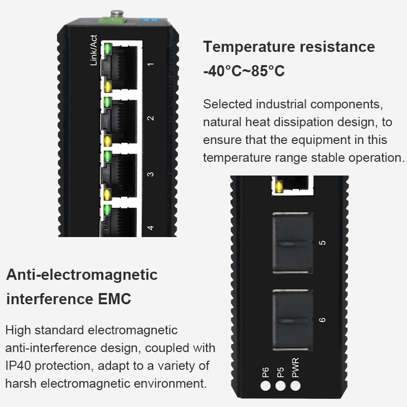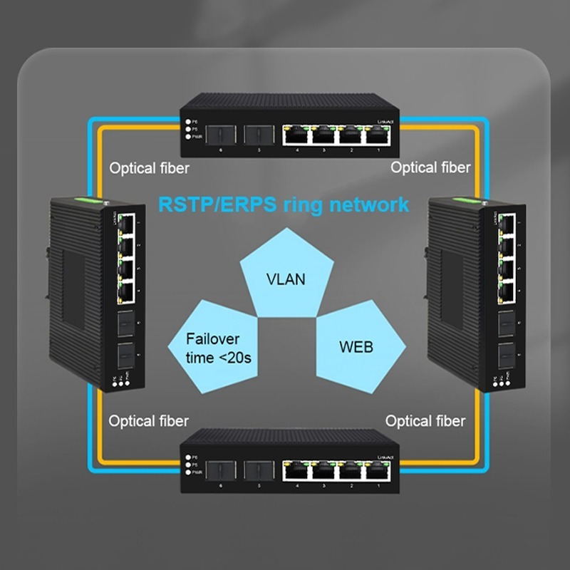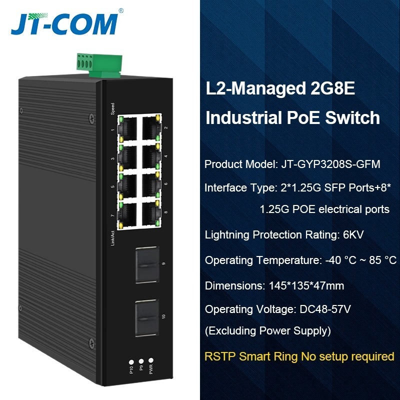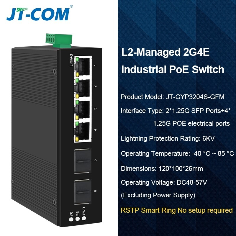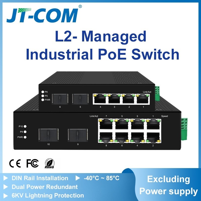 JT-COM Intelligent X-Ring POE Managed Switch Gigabit 8 ports / 4 ports Industrial DiN-Rail Layer 2 Fiber Switch for IP Camera, NVR, Wireless AP, CCTV, AI