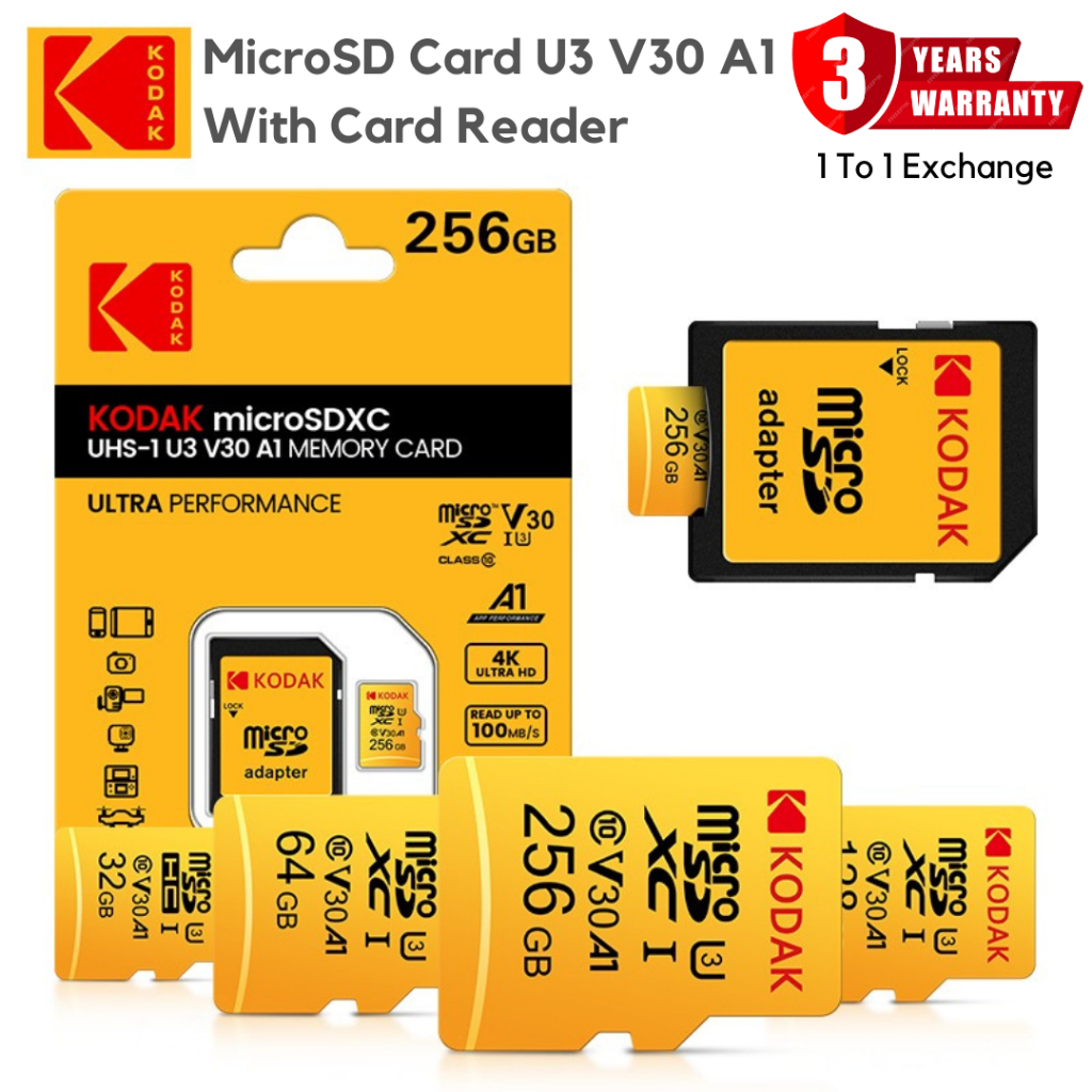 KODAK MicroSD Card with Card Reader 32GB/64GB/128GB/256GB 100MB/s Memory Card With Adapter For Mobile/CCTV/Car Dash Cam