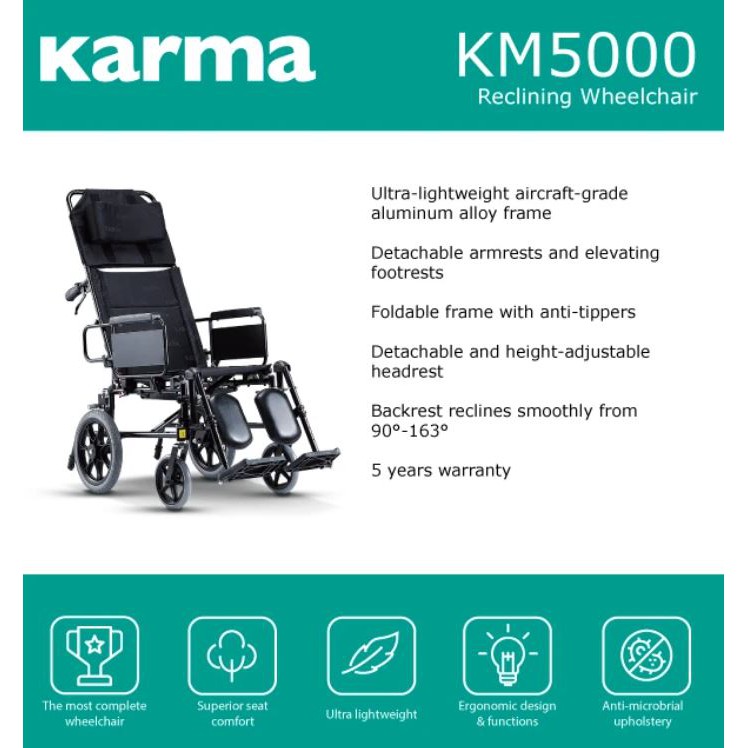 Karma KM-5000 Reclining Transport Wheelchair (Small Wheel : 14 inches)