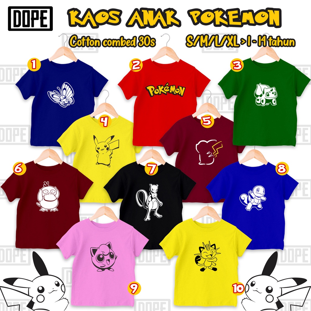 Kids T-Shirt Pokemon Pikachu Mewtwo Meowth Bullbasaur Butterfree Jigglypuff Psyduck Squirtle Boys Girls 1-14 Years Cotton Combed 30s Kids Tshirt DOPE