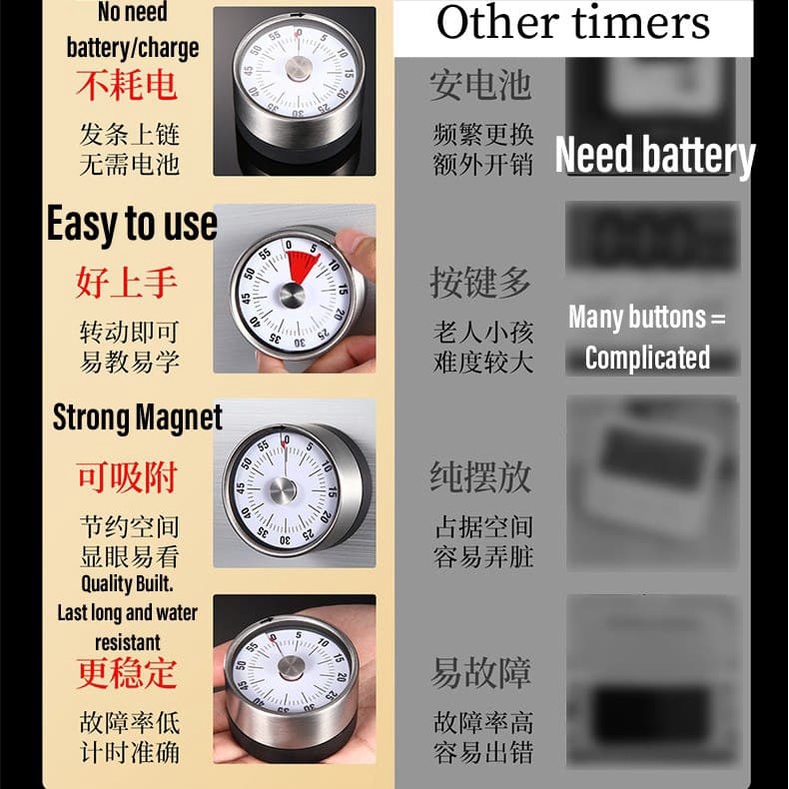 Kitchen Mechanical Timer Stainless Steel Magnet Round Shape 60 Minutes Countdown