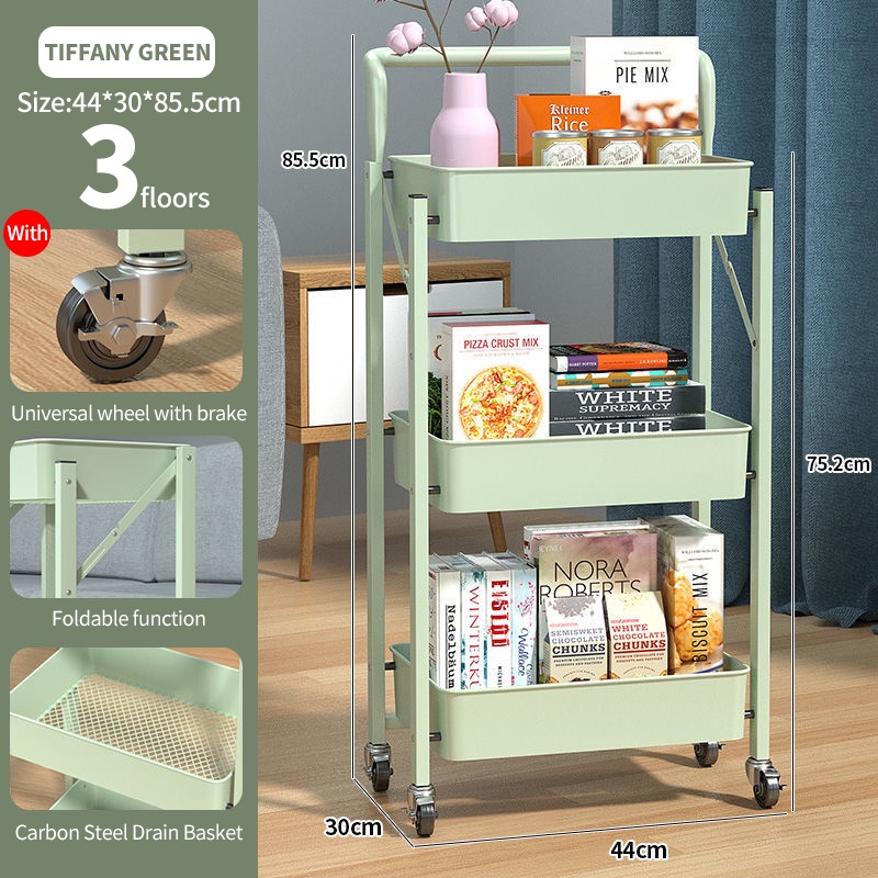 Kitchen Shelf Movable Storage Cart / 3 Tier Multi-functional Trolley / Foldable Metal Trolley / Rack
