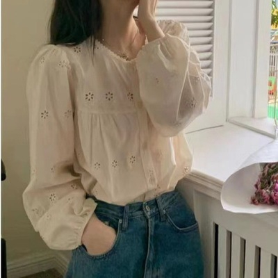 Korean Style Women Ladies Loose Cotton Lace Crochet Long Sleeve Shirt Blouse Baju Baju Wanita Lengan Panjang