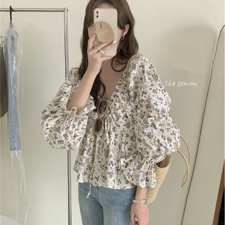 Korean women's retro floral blouse long sleeve off-shoulder style